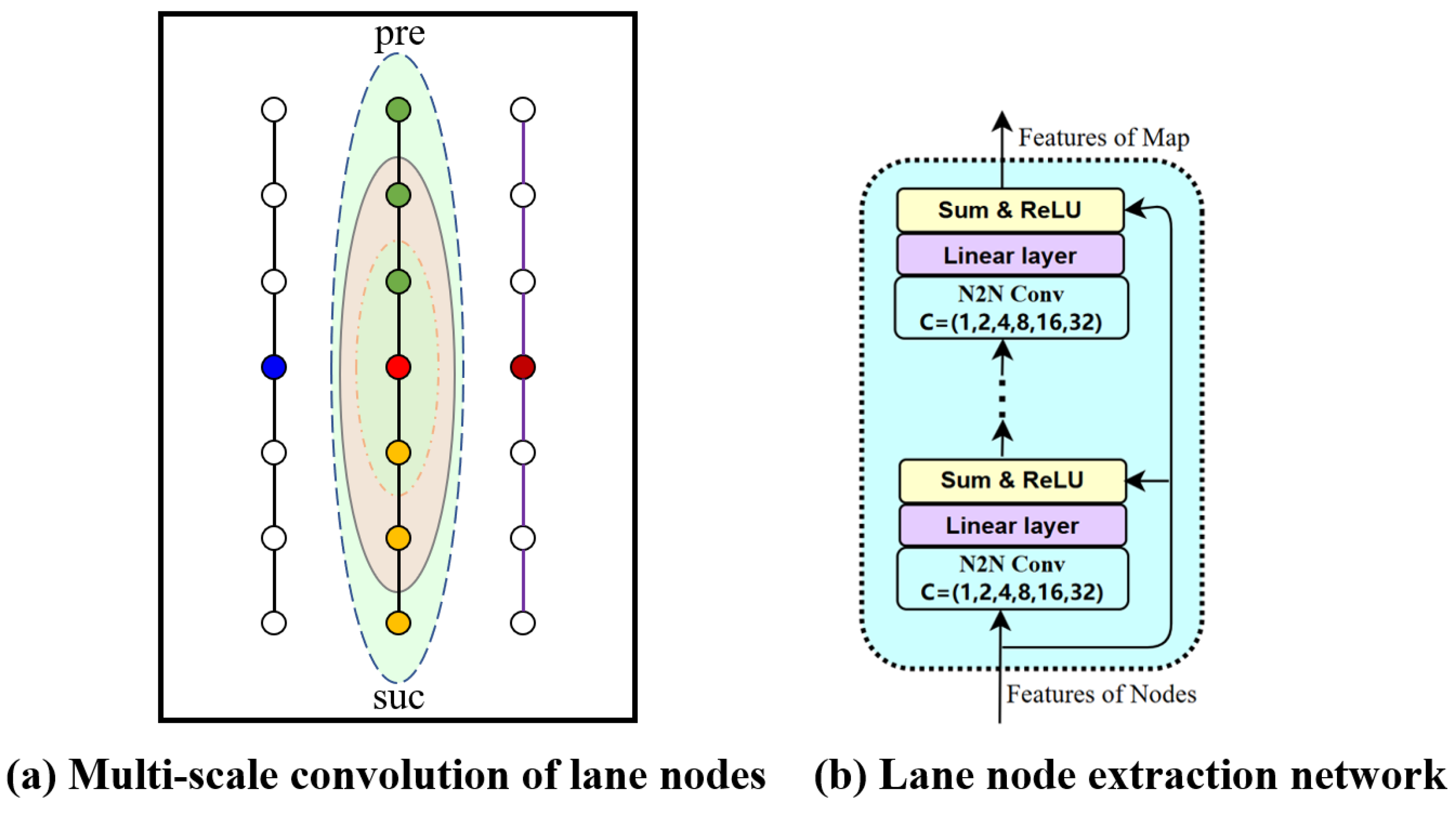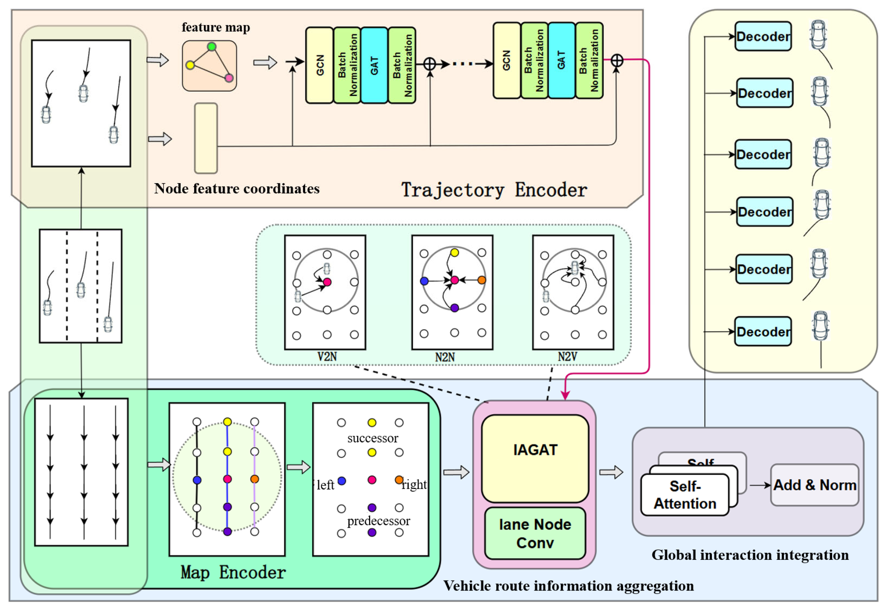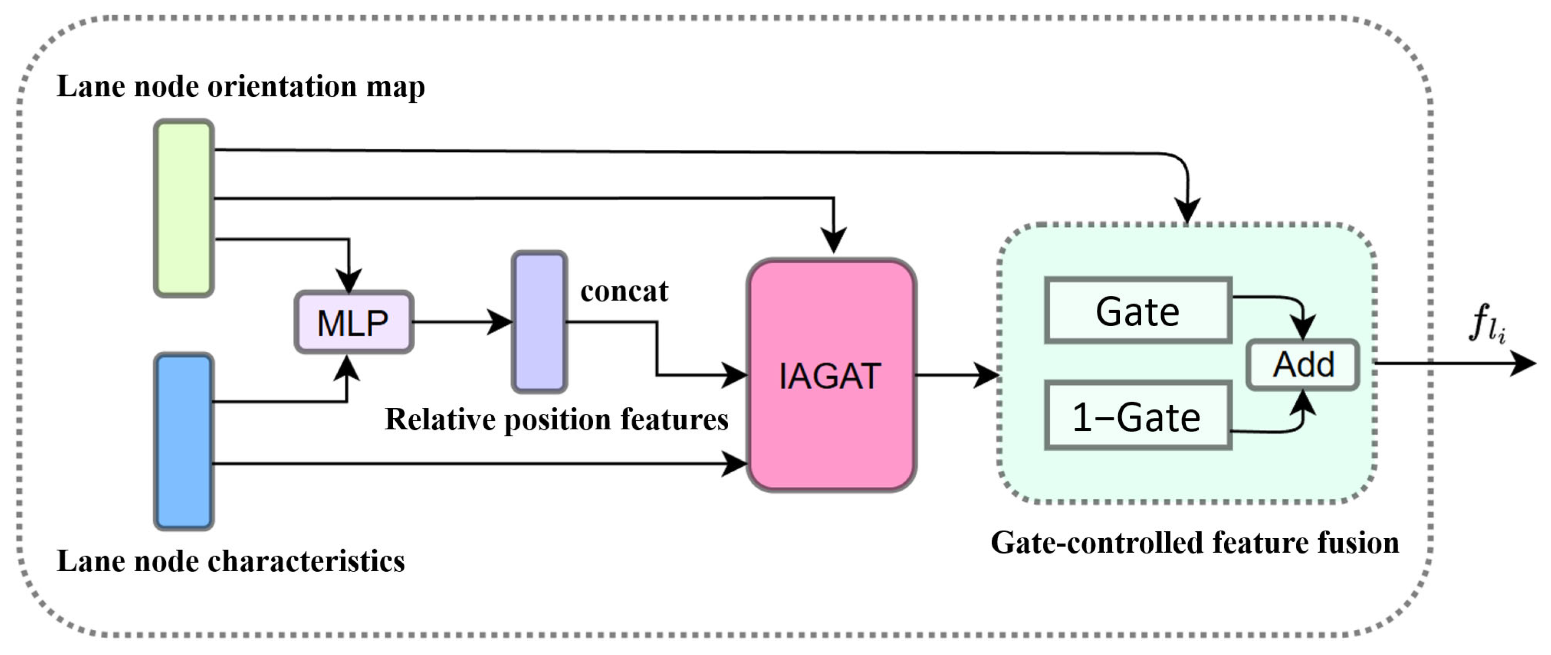 - Lane topology encoding and IAGAT-based fusion: We design a lane topology encoder that integrates geometric and semantic lane attributes through direction-sensitive, multi-scale dilated graph convolutions, transforming vectorized lane centerlines into rich topology-aware representations. On this basis, we introduce an interaction-aware graph attention mechanism (IAGAT) that explicitly models four types of interactions between vehicles and lanes (V2V, V2N, N2V, N2N) and employs gating mechanisms to adaptively fuse structured road information with dynamic spatio-temporal features. These modules are specifically tailored to support the lane-informed interaction fusion in LITransformer.