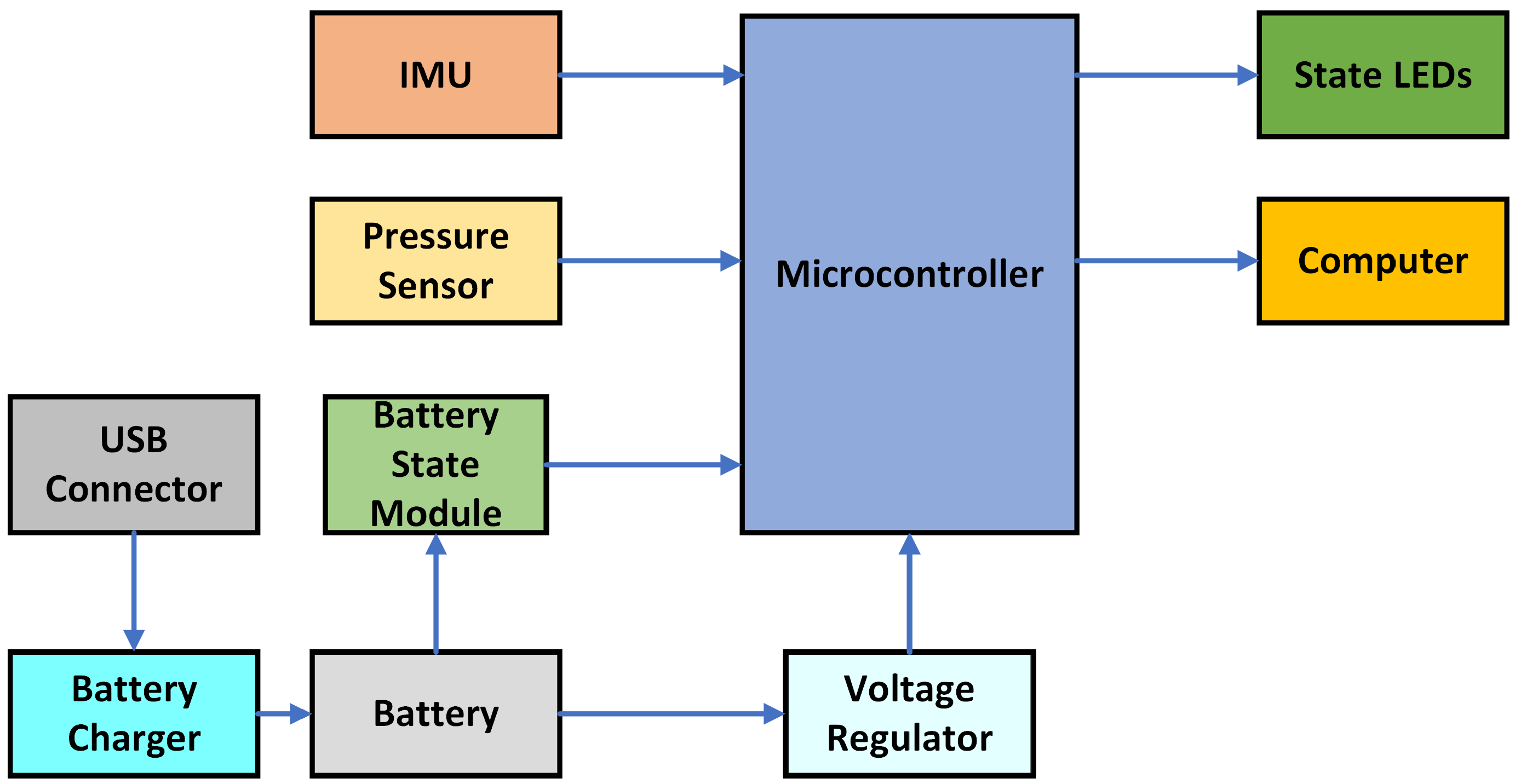 Figure 1, which illustrates the interactions among the sensors, microcontroller, power subsystem, and output components. The system employs a rechargeable Lithium-Polymer (LiPo) battery, protected by a dedicated charge-management module and low-voltage cutoff circuitry to ensure safe operation. Status LEDs provide visual feedback during pairing and activation, while optional tactile buttons offer redundancy for users unable to generate stable pneumatic input.