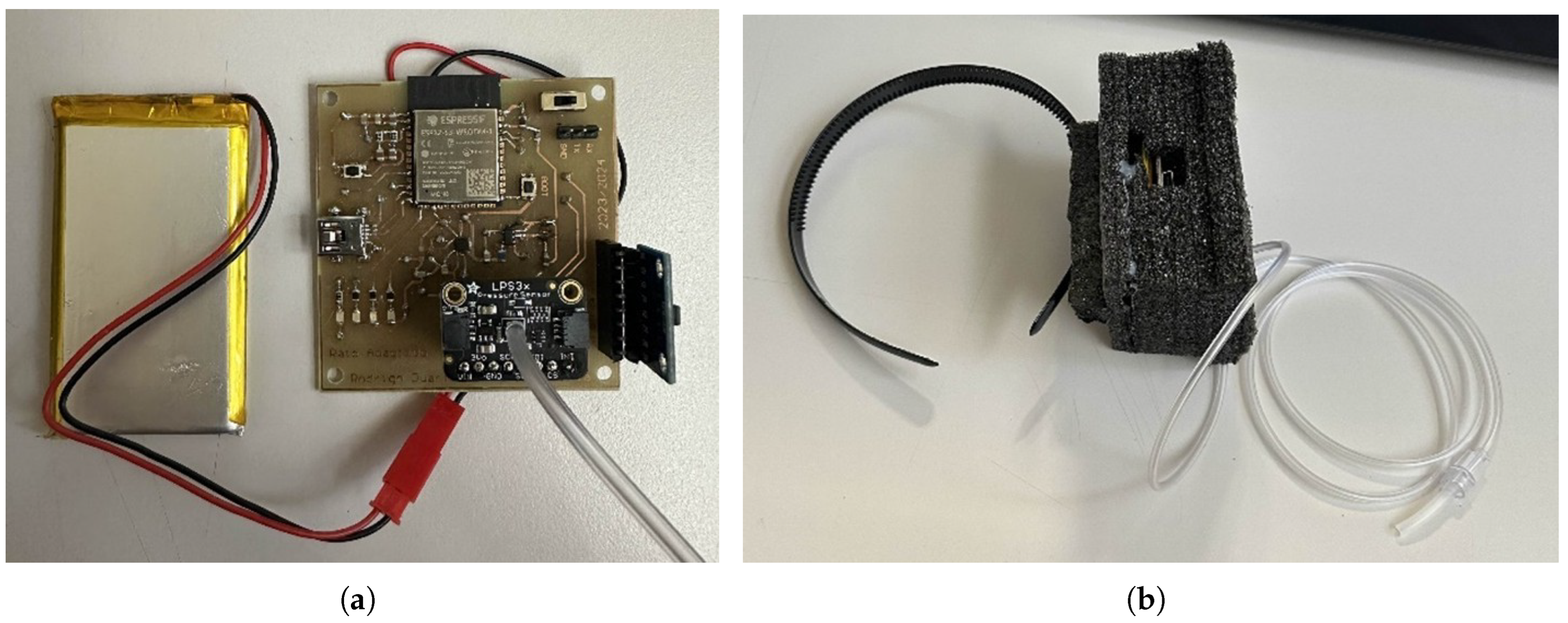 The system employs the LPS33HW pressure sensor due to its small form factor, high resolution, and waterproof housing, which is advantageous in prolonged breath-based interaction scenarios. The sensor communicates with the microcontroller through the I2C protocol and is mechanically coupled to a flexible plastic tube positioned near the user’s mouth. Tube length and diameter were selected empirically to balance breath sensitivity, user comfort, and hygienic considerations.