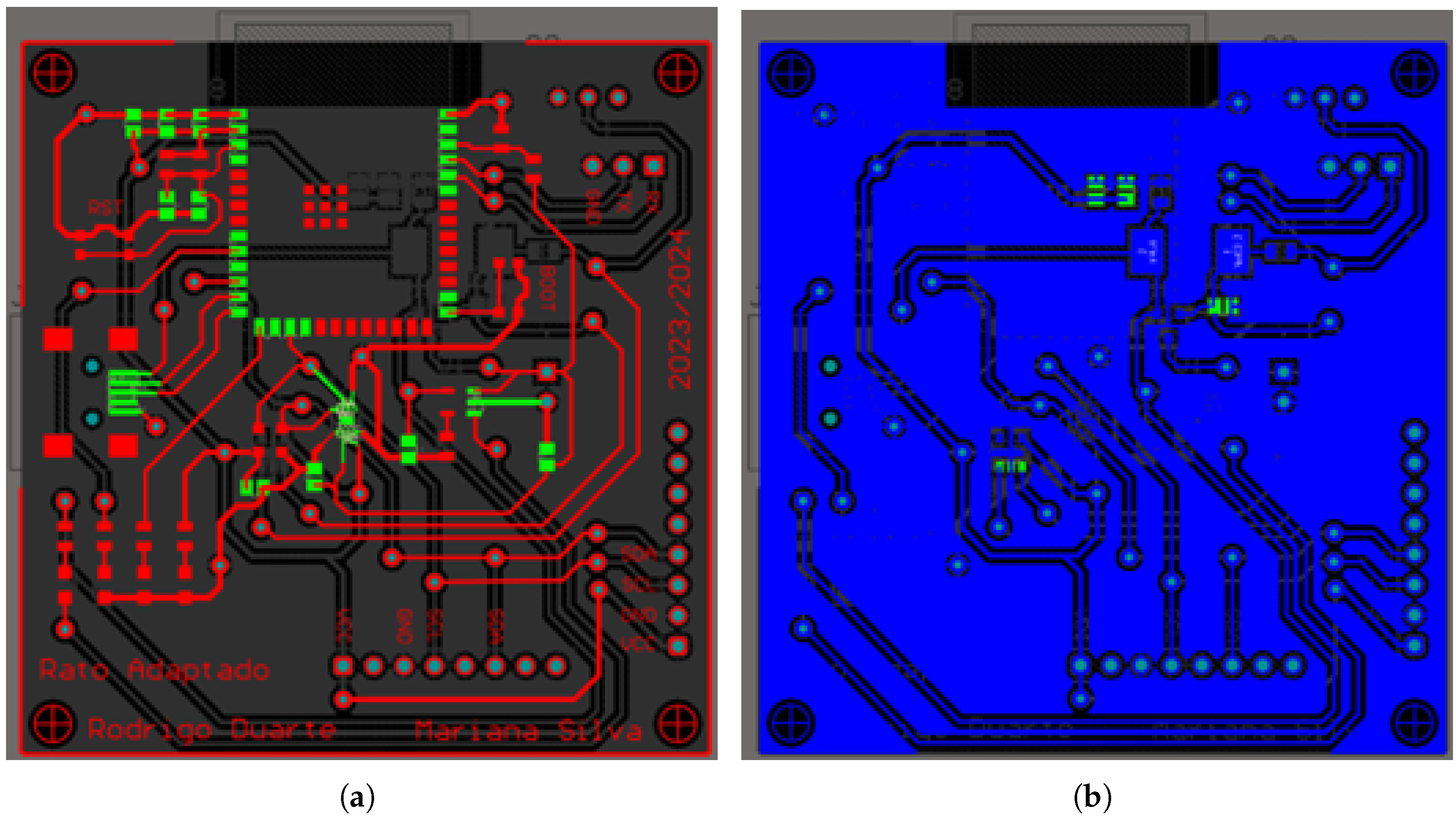 Fabrication was performed in the university electronics laboratory, subject to constraints on minimum trace widths, pad spacing, and via diameters. These limitations prevented direct soldering of some surface-mount components, prompting the addition of 8-pin female headers to accommodate commercial breakout modules (e.g., MPU6050 and battery monitor).