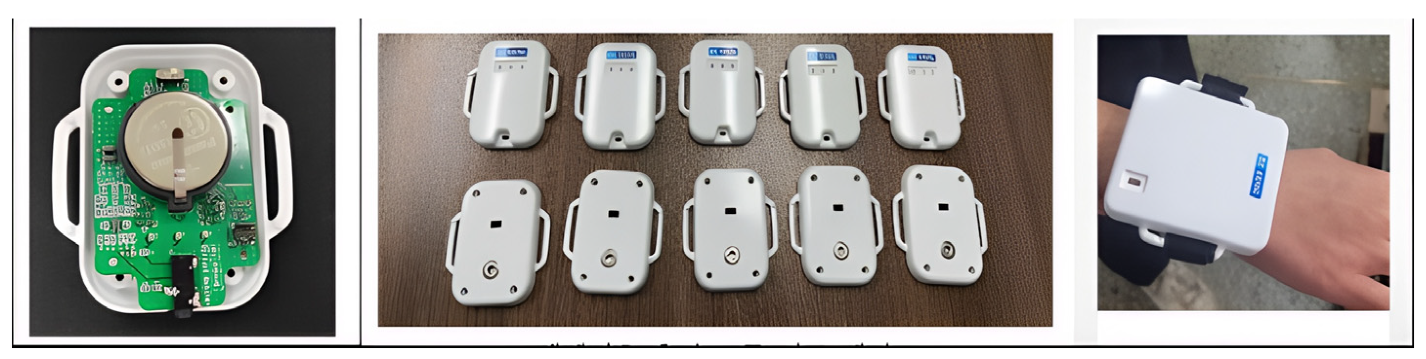 Hanafi et al. showed that utilizing AI wearable devices can enable real-time public health surveillance. This technology has demonstrated the ability to detect disease outbreaks such as influenza or COVID-19 two to six days earlier than conventional methods [48]. To monitor patient condition, we developed modification and production of wireless wearable biosignal measurement devices. The devices’ size was reduced through circuit optimization of wearable biosignal measurement modules. We added gyro sensors for fall monitoring of infectious disease patients wearing wearables. The left panel in Figure 2 shows the manufactured biological signal measurement module and the right panel shows the final products.