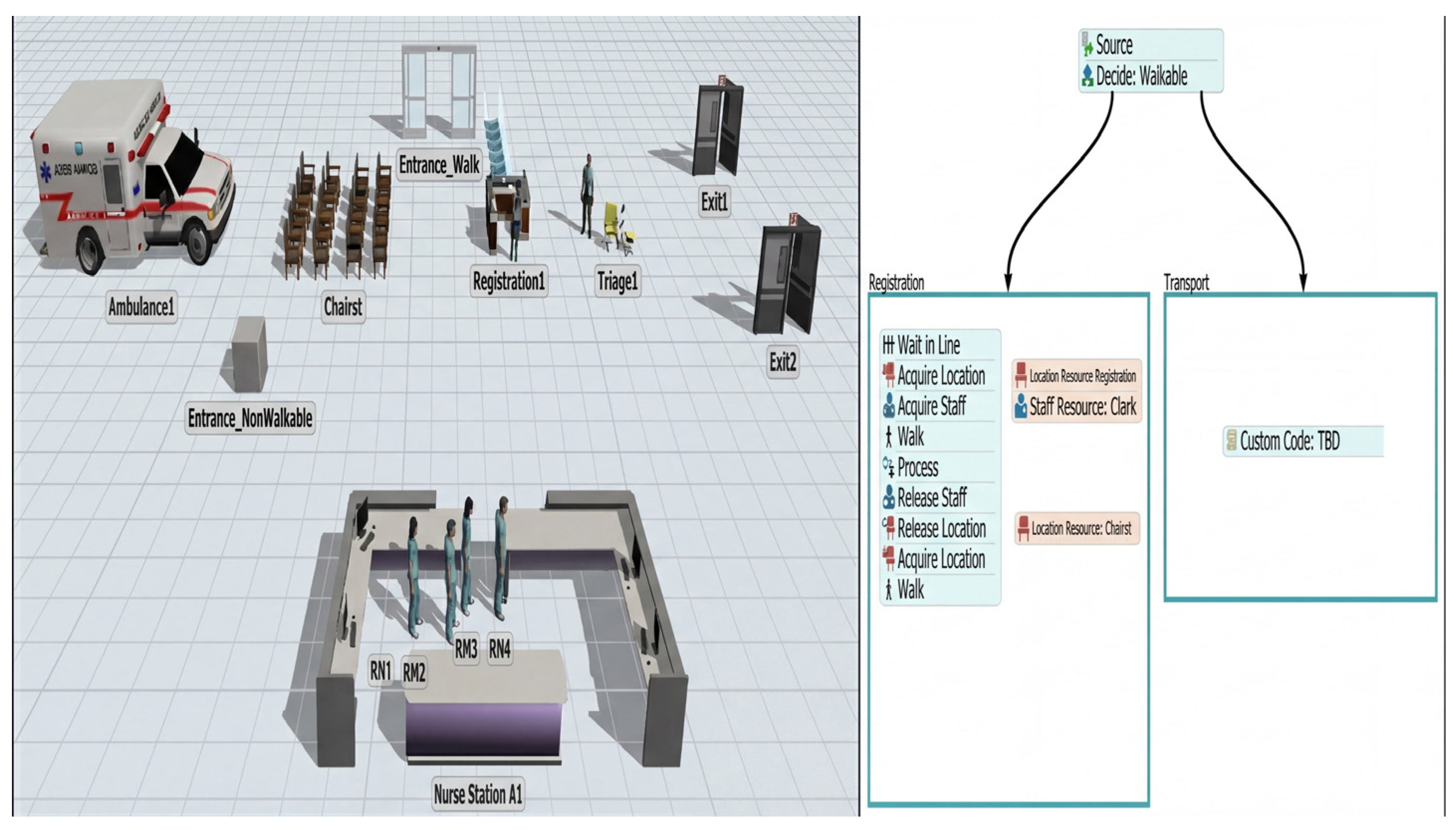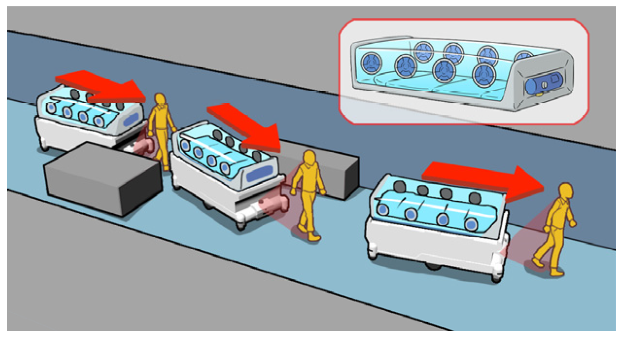 Previous research included nurse-following robots, but none combined them with negative pressure bed robots. Furthermore, no studies extended to digital twins. Hospital corridors are dynamic spaces constantly bustling with medical staff, patients, visitors, and various mobile equipment. Robots must possess advanced navigation capabilities to detect and safely avoid multiple obstacles exhibiting unpredictable movements in real time [44]. Thus, the digital twin is required before nurse-following robot adoption, and running the simulation under various scenarios is required. Building a digital twin in the healthcare industry was a research topic, but the federated digital twin concept has never been studied. This research addresses the negative pressure bed robot—a previously unexplored form of nurse-following robot—discusses the elements necessary for its digital twin implementation, and presents a case study of designing simulations to realize the digital twin.