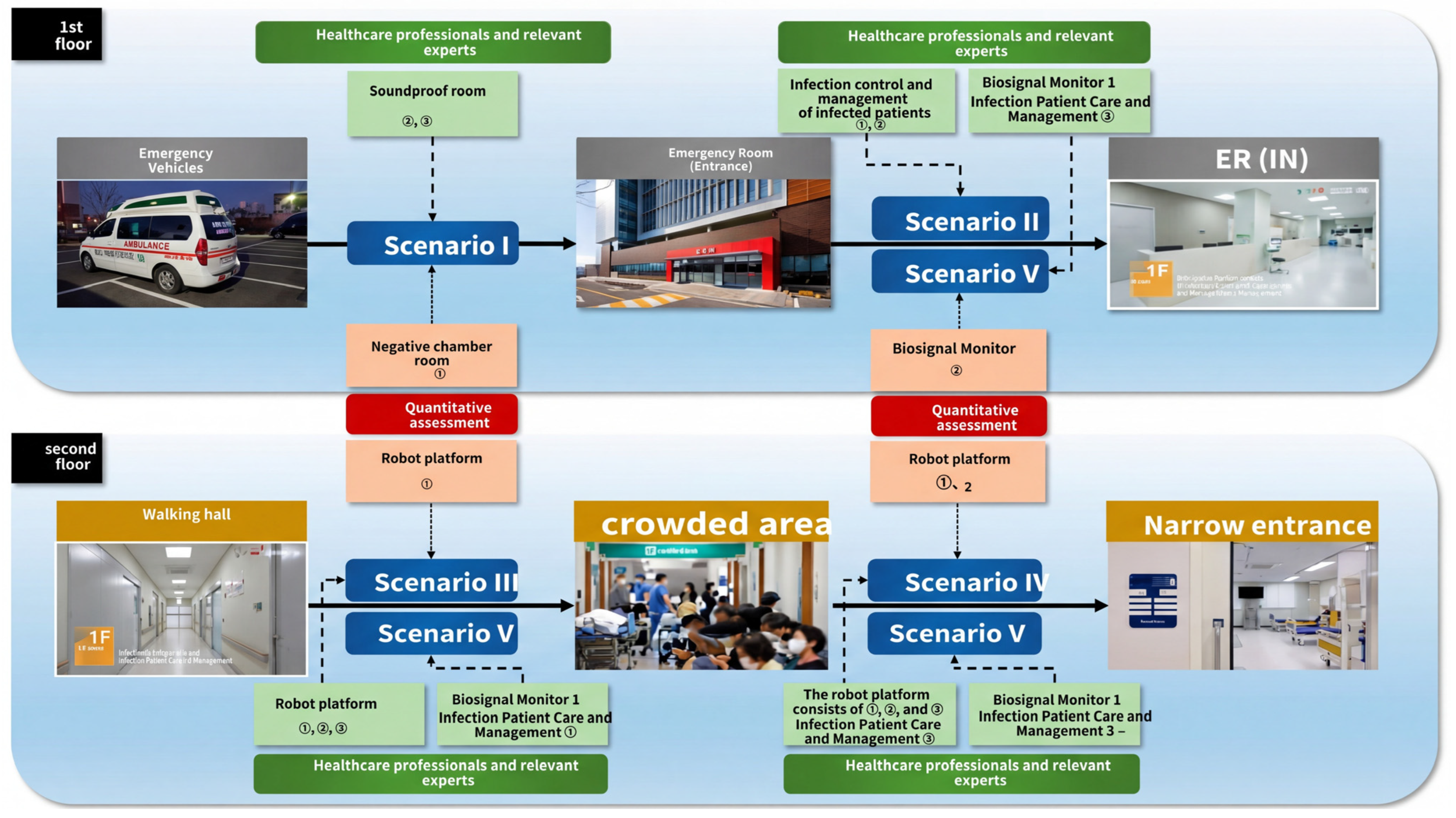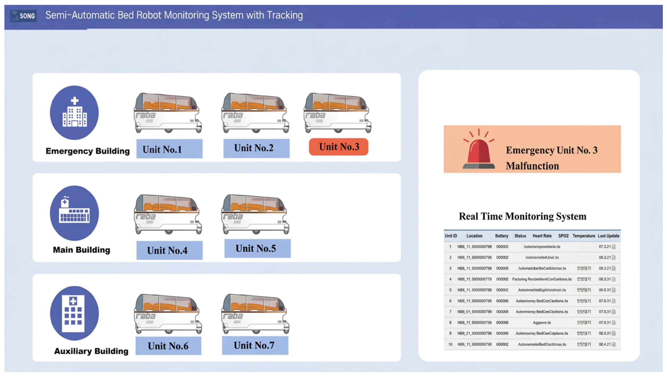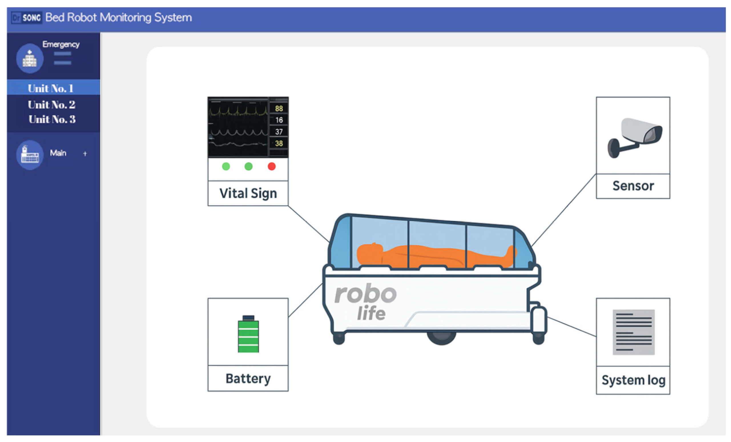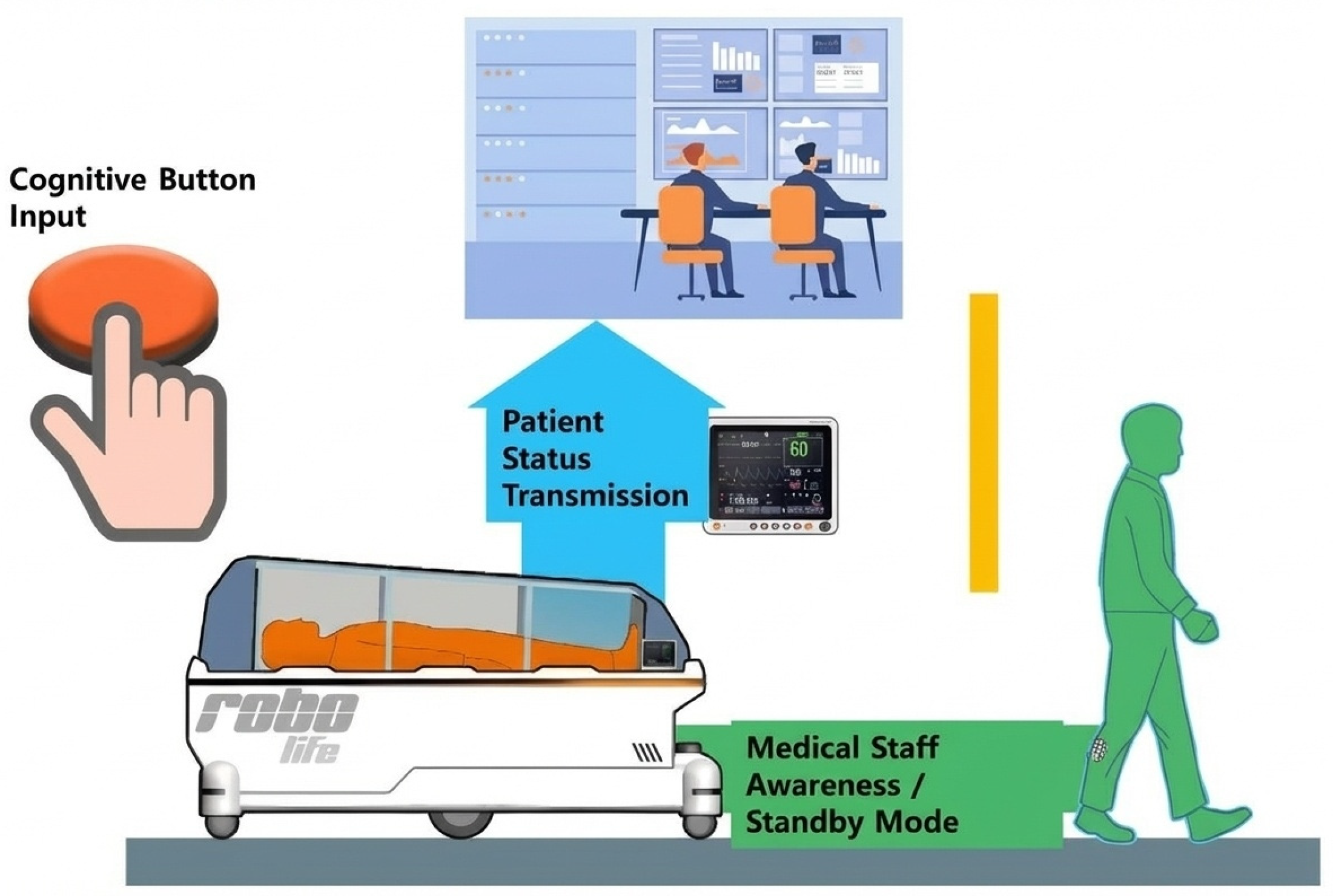 • Patient Status Transmission: Monitoring equipment installed on the robot measures the patient’s biosignal in real time. This information is transmitted to a central control system.
