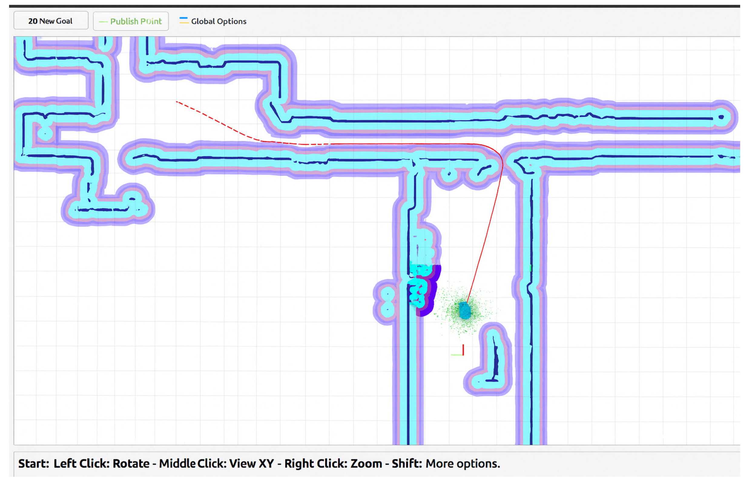 The first step to build a digital twin for the medical bed robot is to identify the terrain where it operates. Two-dimensional pathways of the hospital inpatient ward are pre-processed before the medical bed robot is launched as shown in Figure 7. This represents the hospital’s inpatient ward. The black lines indicate fixed obstacles such as ward walls and pillars. The light blue areas denote ‘safe zones’, where the robot can move, or open spaces like corridors. The purple area (Costmap) is a buffer zone around obstacles like walls. When planning its path, the robot avoids this purple area as much as possible to reduce collision risk. The map displays the robot itself and the information it perceives in real-time. Green arrows/icons indicate the robot’s current position and direction on the map. Blue and dark blue dots/areas represent obstacles detected in real time by the robot’s sensors (primarily the LiDAR laser scanner). Based on this real-time information, the robot can also avoid sudden obstacles. The red line represents the optimal path calculated from the robot’s current position (green icon) to the target point. This path is intelligently generated to safely reach the destination while avoiding both walls (purple areas) and real-time obstacles (blue areas).