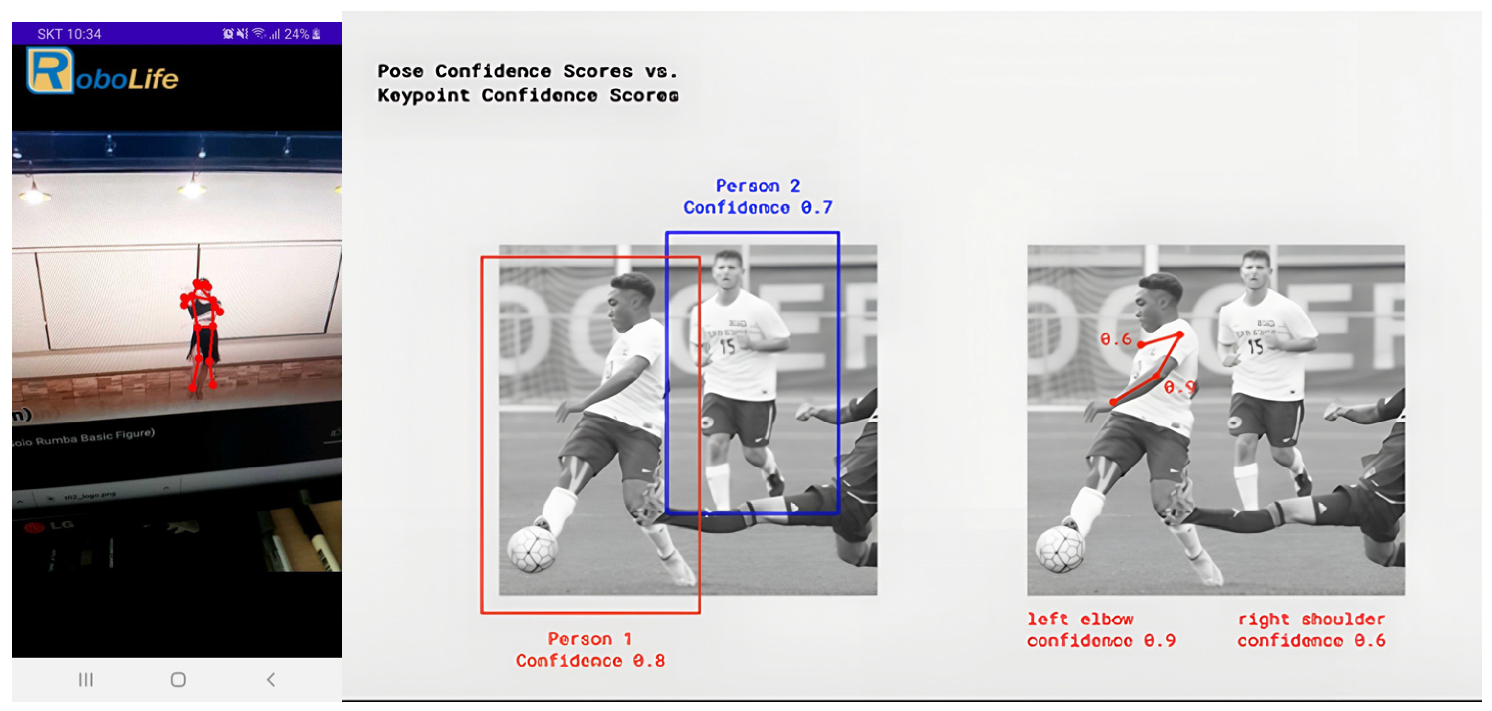The second step is recognizing human objects, including the nurse to follow and passersby in the ward. The third step is visualizing the multi-dimensional data and objects using vertex and mesh as shown in Figure 8. The right side of Figure 8 shows how the AI model interprets the image. The object detection recognizes objects using the bounding boxes and the confidence scores on them. A red line is drawn on the arm portion of the player image on the far right. This visualizes the ‘Pose Estimation’ technology to track key joint positions in humans. Models like PoseNet perform precisely this function. The PoseNet model (TensorFlow.js version 3.20.0) is used to recognize human objects. PoseNet is a deep learning model developed by Google that enables real-time estimation of one or multiple poses within images or videos. PoseNet detects 17 key body parts (keypoints), such as shoulders, elbows, knees, wrists, and ankles, and outputs their coordinates. One of PoseNet’s greatest strengths is its lightweight and fast execution, allowing it to run directly in a web browser. The smartphone screen on the left of Figure 8 shows an example of how object detection algorithms are ultimately delivered to users.