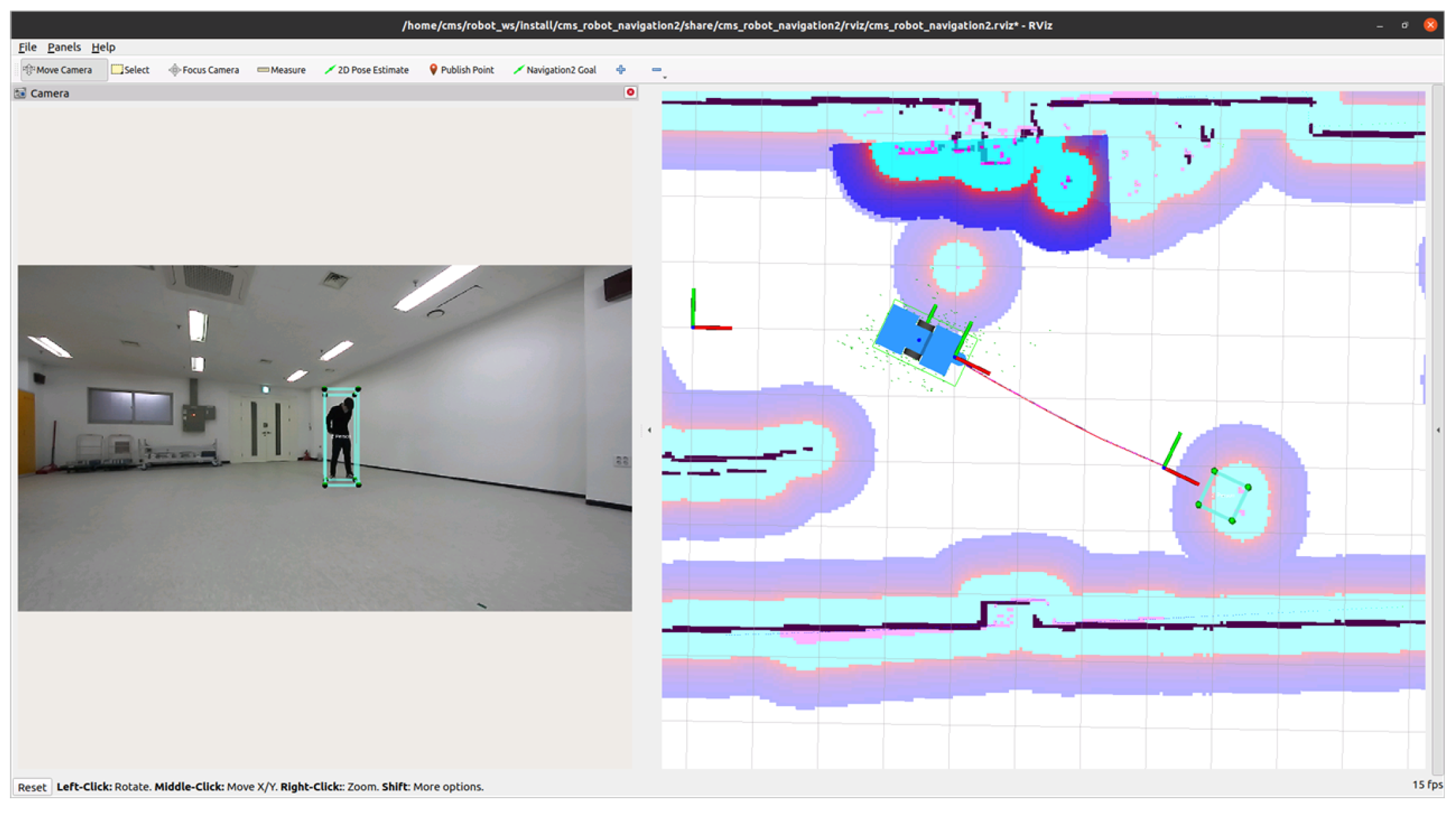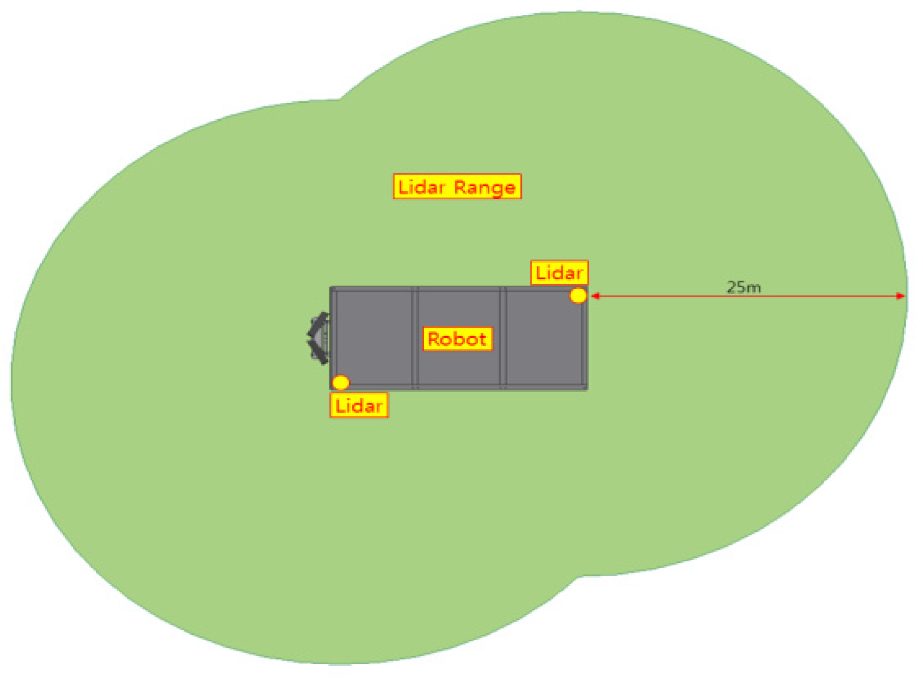 The last step is correlating the medical bed robot and the nurse object to follow, using the optimally arranged sensors, including LiDAR, as shown in Figure 9. The left figure in Figure 9 is a schematic showing the placement and detection range of the LiDAR sensors mounted on the robot. It visually illustrates that the robot can detect its surroundings, including the front and rear, up to a maximum of 25 m using two LiDAR sensors. Two depth cameras are installed and used to estimate a person’s posture. The right side appears to be a user interface (UI) screen showing the robot actually recognizing its environment. The left side displays camera footage, while the right side shows a 2D map generated based on sensor data.