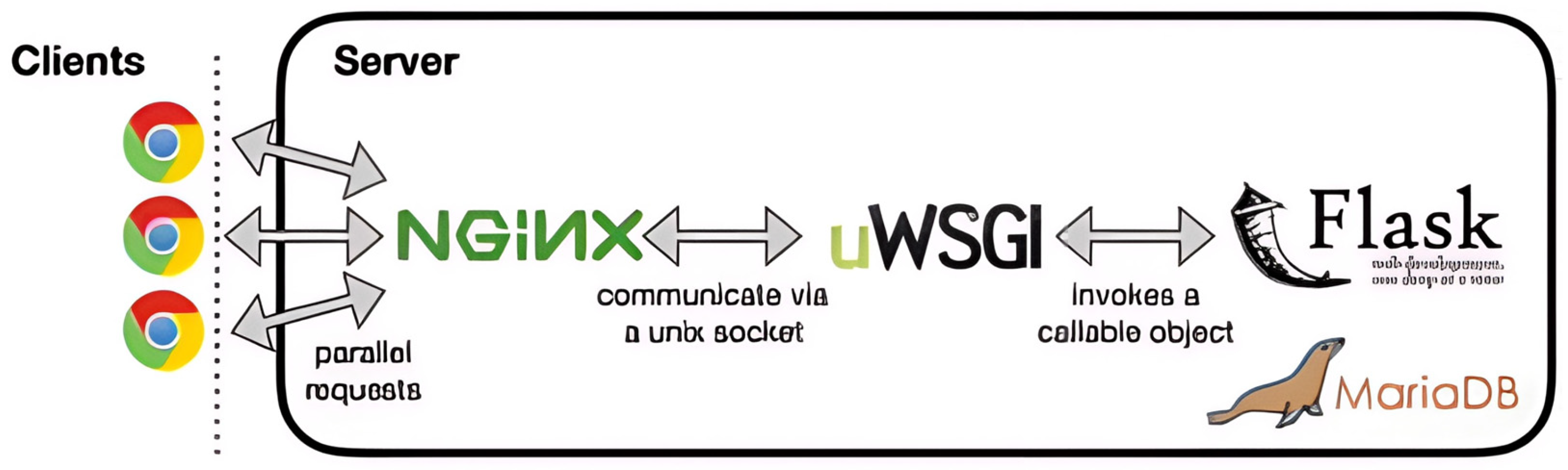 HTTP client ↔ Nginx ↔ uWSGI ↔ Python3.0 app.