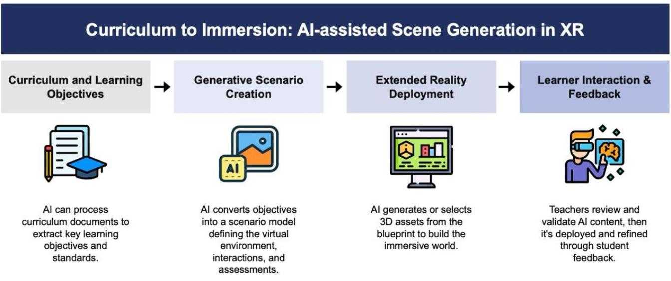 17]. The architecture of the framework is systematic and chronological in nature, starting with pedagogical intent (Curriculum), then intelligent creation of content (AI), advancing to immersive delivery (XR), and finally dynamic interaction with the learner and feedback [