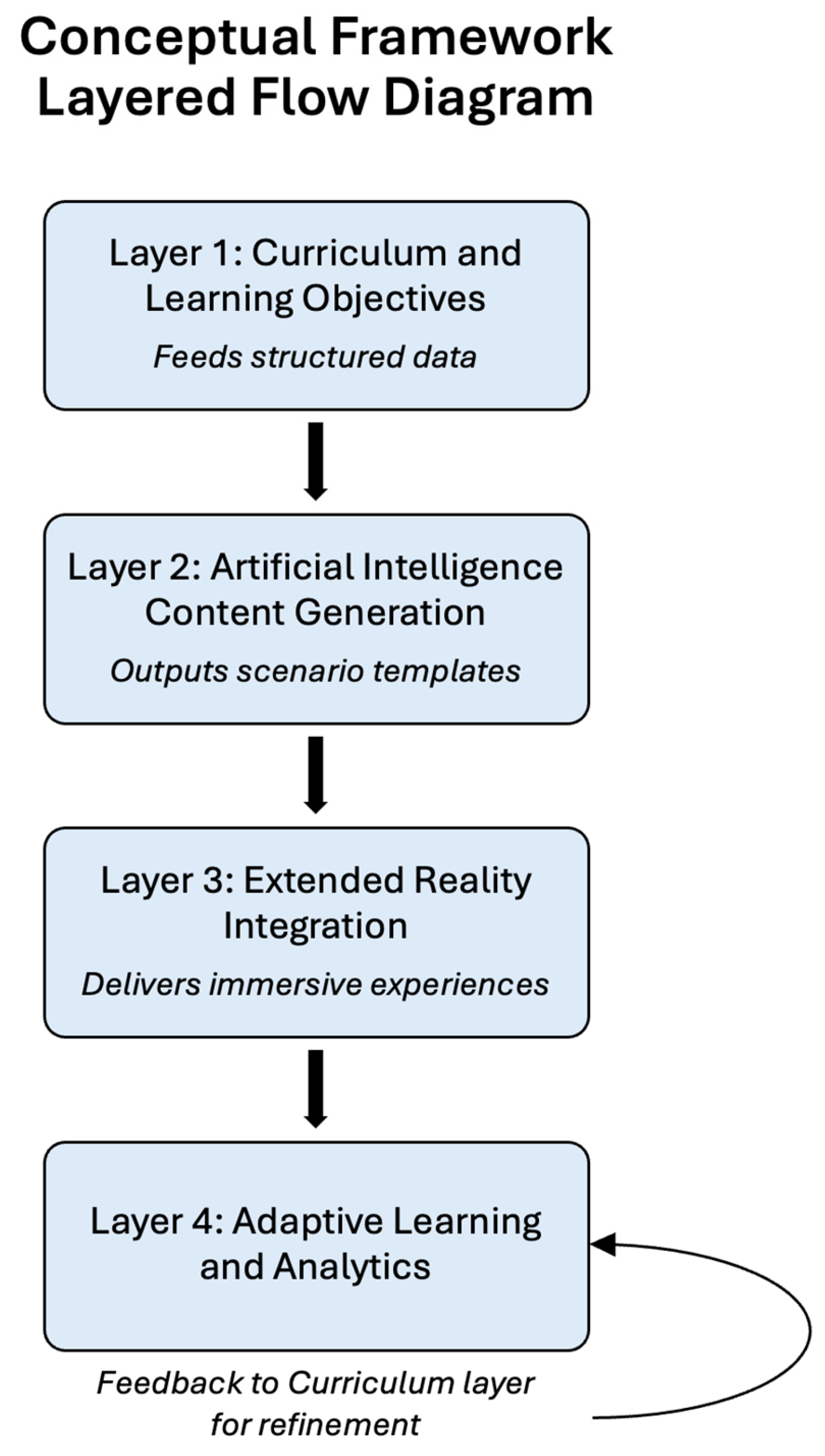 A four-layer simulation pipeline where each layer contributes a distinct function—from curriculum encoding to adaptive feedback—represents an end-to-end learning framework. In