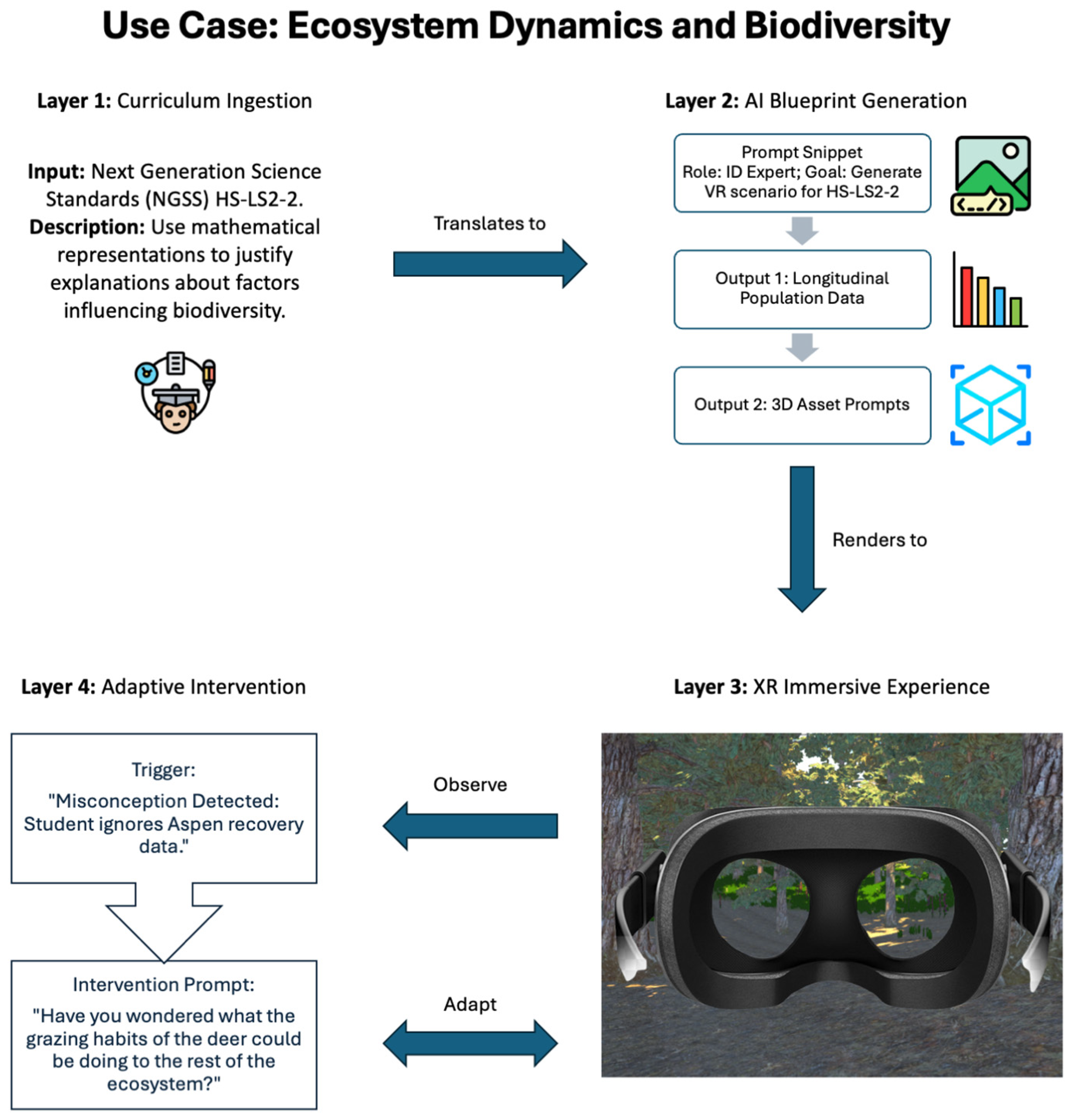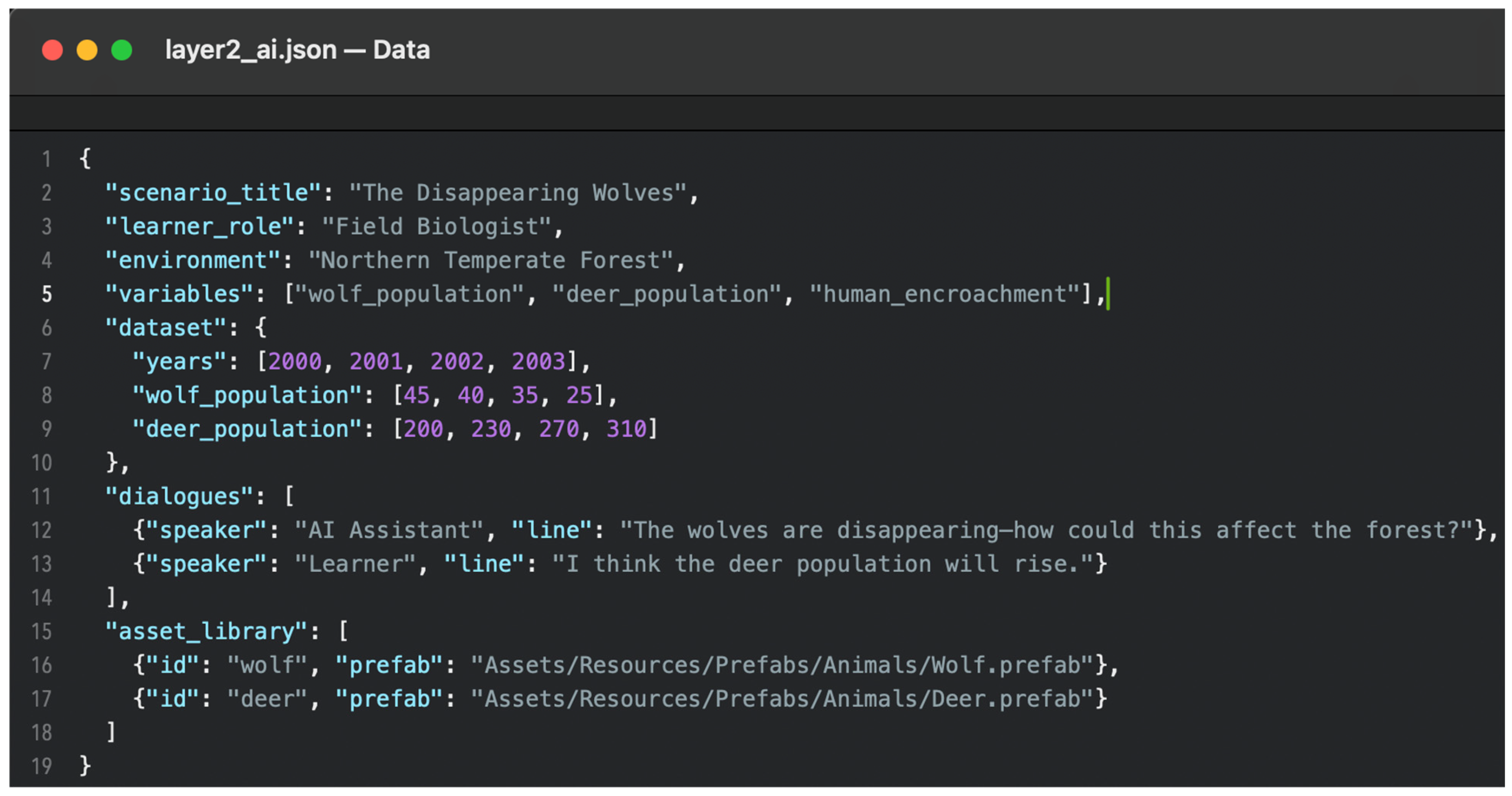 AI Layer Output: The AI creates a template scenario for a virtual forest ecosystem simulation. It generates a story that puts the learner in the role of a field biologist studying a dying gray wolf population, dialog with an AI research assistant, simulated longitudinal data on species populations and environmental factors such as annual rainfall and human development encroachment over 20 years, and a library of 3D models of the related flora and fauna. The second layer is where the AI model decodes the Layer 1 JSON and generates a multimodal blueprint in the form of a JSON file (“layer2_ai.json”). This blueprint determines the narrative, the 3D asset library, and the simulation parameters in the form of population data and environmental variables. All the parts of the scenario, wolf and deer, are linked to a path compatible with Unity. By using the following prompt in Claude, we were able to interpret the structured data generated in Layer 1: “Using this JSON curriculum structure, generate a virtual forest ecosystem scenario where the learner investigates declining wolf populations. Include: storyline, dataset, dialogs, environment description, and 3D asset tags.”