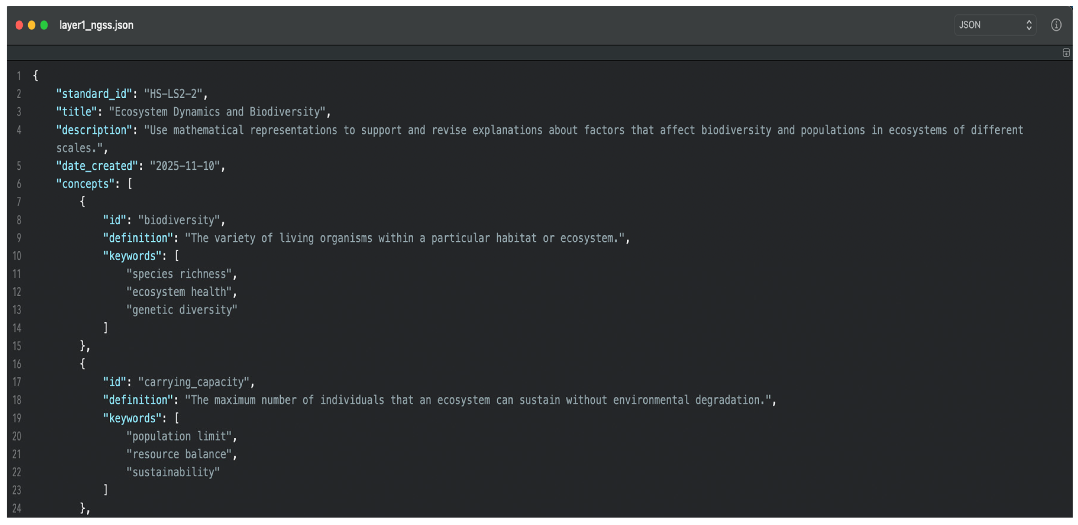Curriculum Layer Input: This situation is based on the NGSS, which states that students should be able to use mathematical representations to justify and update evidence-based explanations about factors that influence biodiversity and populations in ecosystems of various sizes. This layer breaks down the important concepts (biodiversity, carrying capacity, ecosystem resilience) and skills (data analysis, evidence-based explanation) of this topic. The layer implements the Standard by putting its main ideas and abilities in a machine-readable form. The Python 3.14 version was used to create a structured JSON file (“layer1_ngss.json”), which breaks down the NGSS statement into individual conceptual, procedural, and performance units.