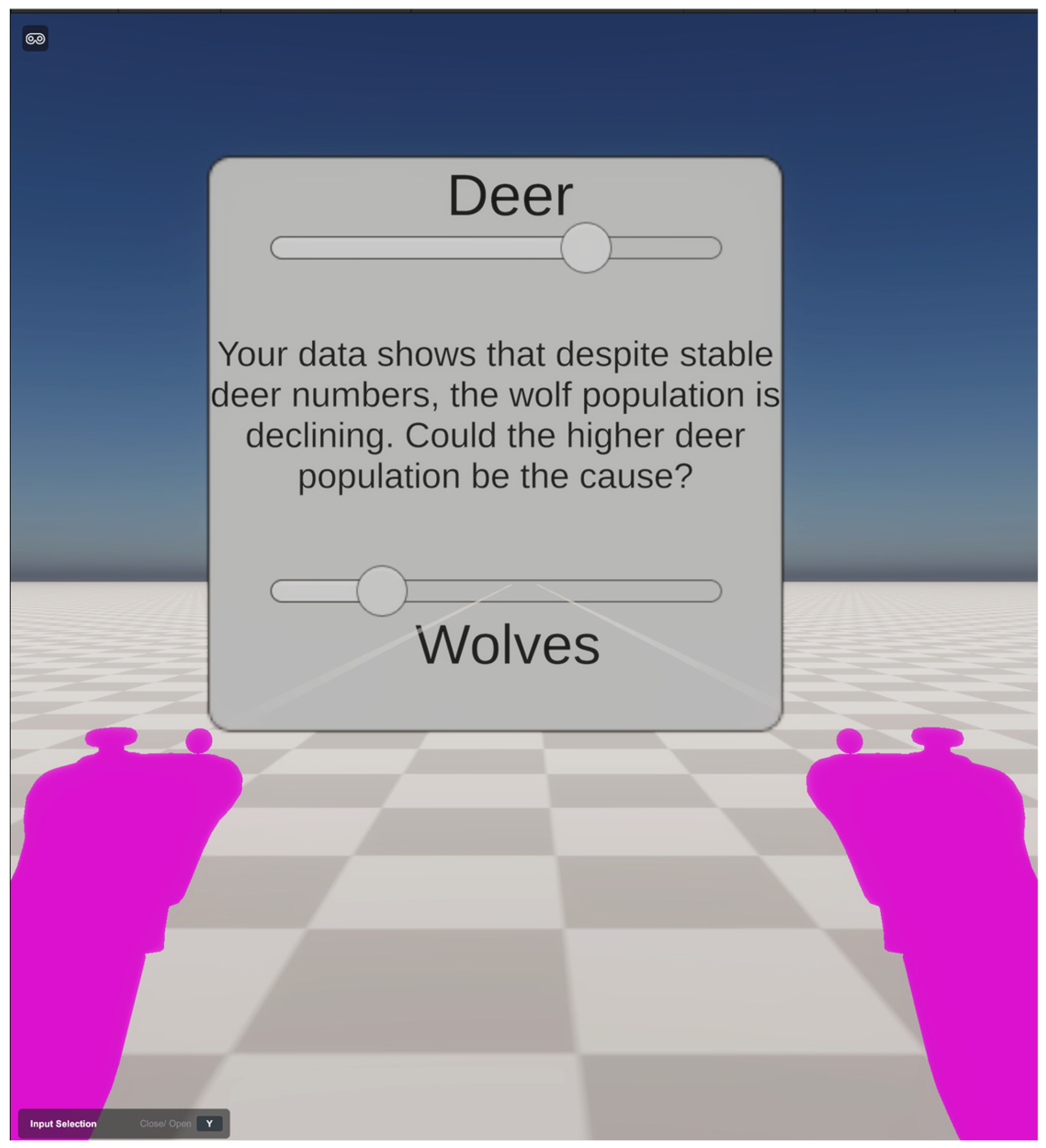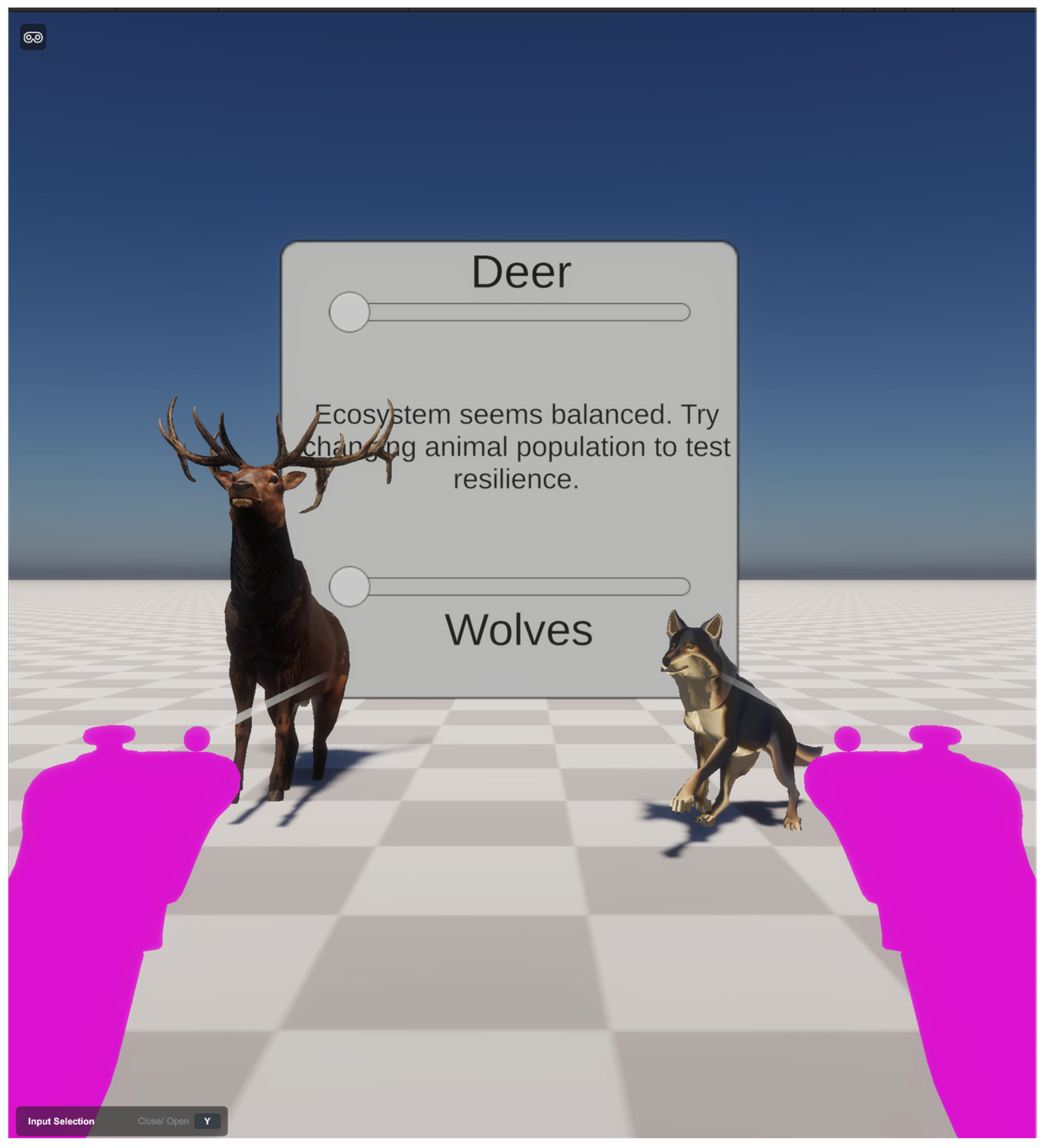 The project uses an XR Origin (XR Rig) that is set up with two ray interactors for teleportation and UI manipulation. The students drive through the simulation and operate the data instruments, which are shown in a Tablet UI, which is a world-space canvas. Two sliders that demonstrate variables within the ecosystem, such as the population of wolves and the population of deer, are found on this tablet. The sliders have events that are attached to the UpdateSimulation() method in the SimulationManager, which provide the learner with instant feedback between the learner and the state of the simulation, as shown in