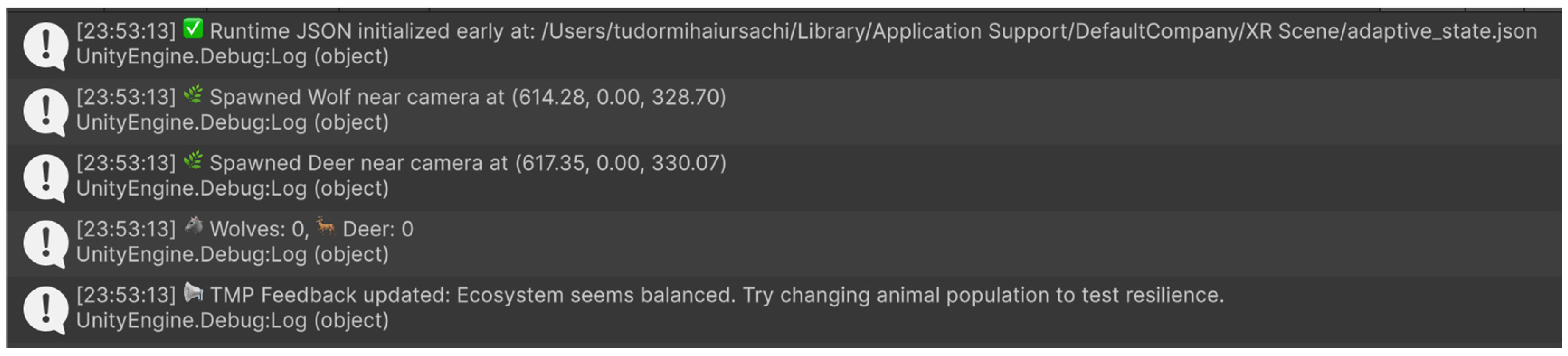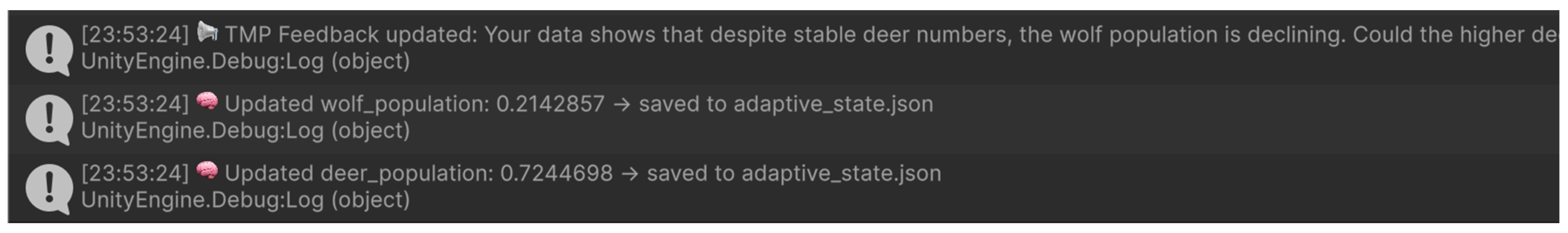 On the tablet, there is a TextMeshPro component used as the adaptive feedback display. The AdaptiveFeedback script interprets the values of the existing sliders and creates prompts in the context (e.g., the fact that the stable deer population with decreasing aspen groves indicates overgrazing). This element is the scaffolding adaptive feature that directs learners in the identification of higher-level ecological interrelations, such as trophic cascades.