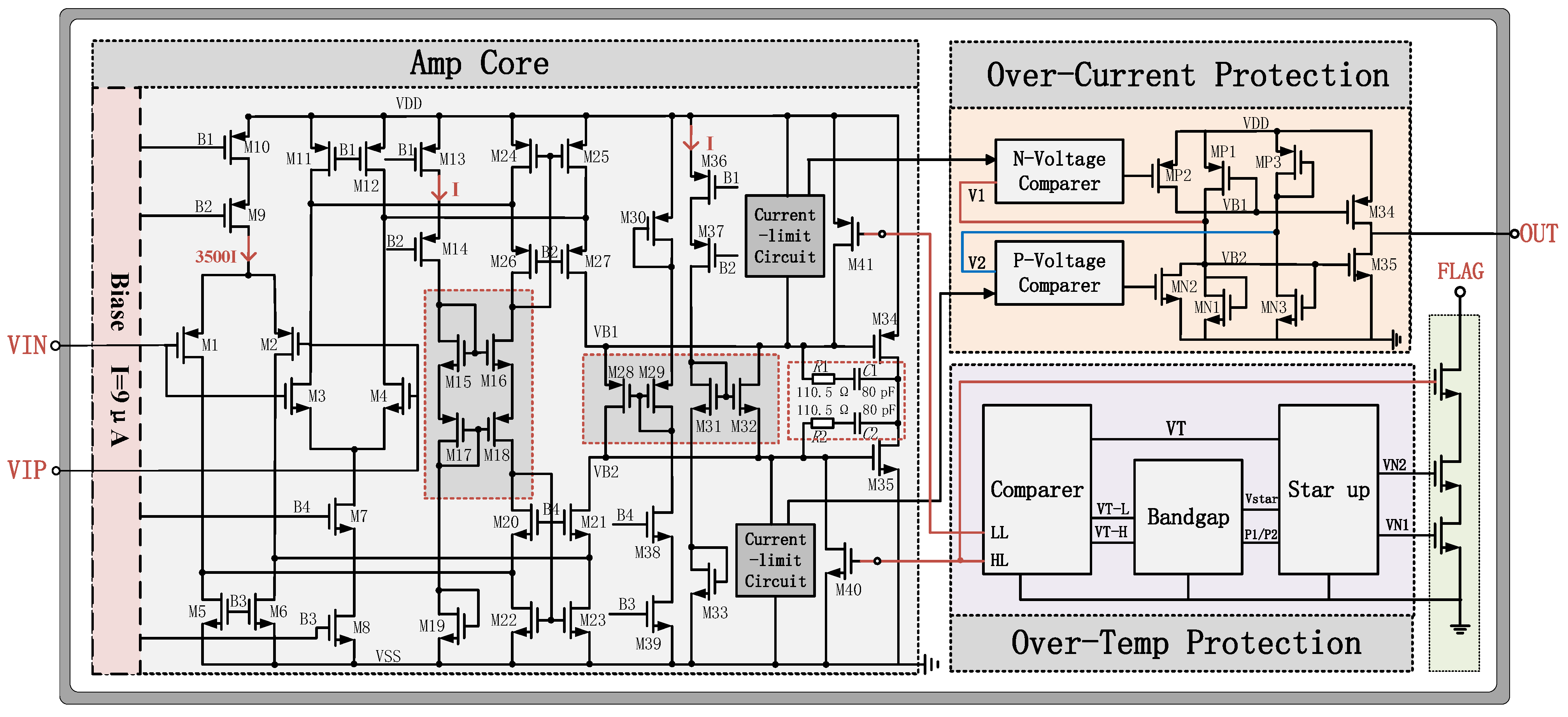 - Feng, S.; Yu, D.; Ma, K.; Yang, F. A high-speed power operational amplifier with over-temperature indication function. Semicond. Technol. 2020, 50, 273–281+312. [Google Scholar]