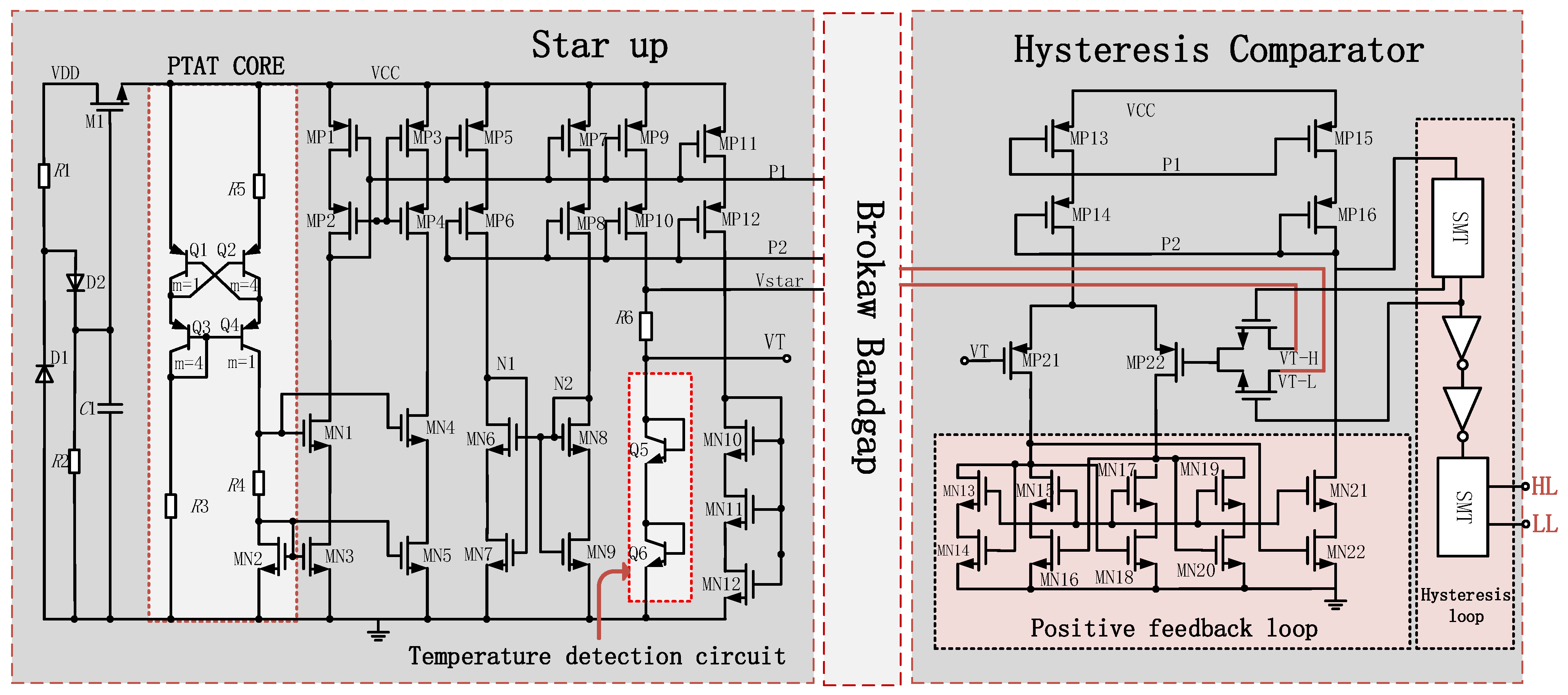- He, S.; Ma, K.; Yang, F. Design of High-Precision Bandgap Reference Source with Over-temperature Protection Function. Intell. Comput. Appl. 2023, 13, 107–113. [Google Scholar]