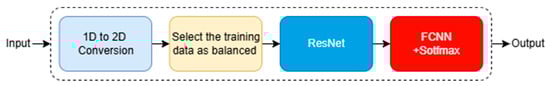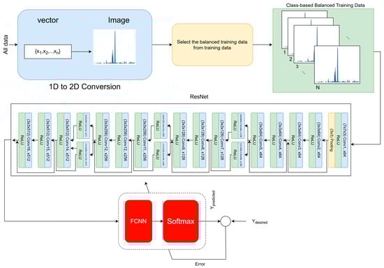 Given that the original dataset consists of one-dimensional sensor readings, a critical pre-processing step involves transforming these time-series signals into two-dimensional color-encoded image representations. This conversion facilitates compatibility with convolutional architectures, which are inherently optimized for spatial pattern recognition. The transformation also enables the model to exploit the structural regularities in signal morphology through two-dimensional convolutions. Since the dataset consists of one-dimensional sensor measurements, each feature vector is transformed into a two-dimensional RGB image so that it can be processed by ResNet. The full procedure is as follows: the 1D vector is first normalized to , then reshaped into a compact 2D grid that preserves the original feature ordering. This grid is converted to a three-channel representation through a fixed colormap, producing an initial pseudo-image. Finally, the pseudo-image is resized to to match the input requirements of ResNet while keeping the relative spatial arrangement of features intact. This transformation enables the network to learn local co-activation patterns across neighboring features using 2D convolutions.