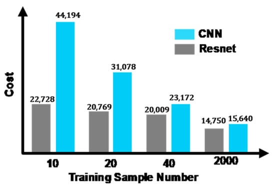 Cost with respect to training sample number for ResNet and CNN.