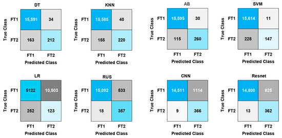 The confusion matrices are shown in Figure 5 give us to visualize the performance of all algorithms. RUS is a bit better than the proposed framework, the reason why RUS has utilized all data samples. We also show that P, R, S, F1 metrics are not convenient to measure the performance of the classifiers for this problem. For example, KNN is missed 42% FT2; however, its performance is very well regarding P, R, S, and F1 metrics. It should be noted that the classification performance of the ResNet trained with only ten samples is better than all algorithms except RUS.