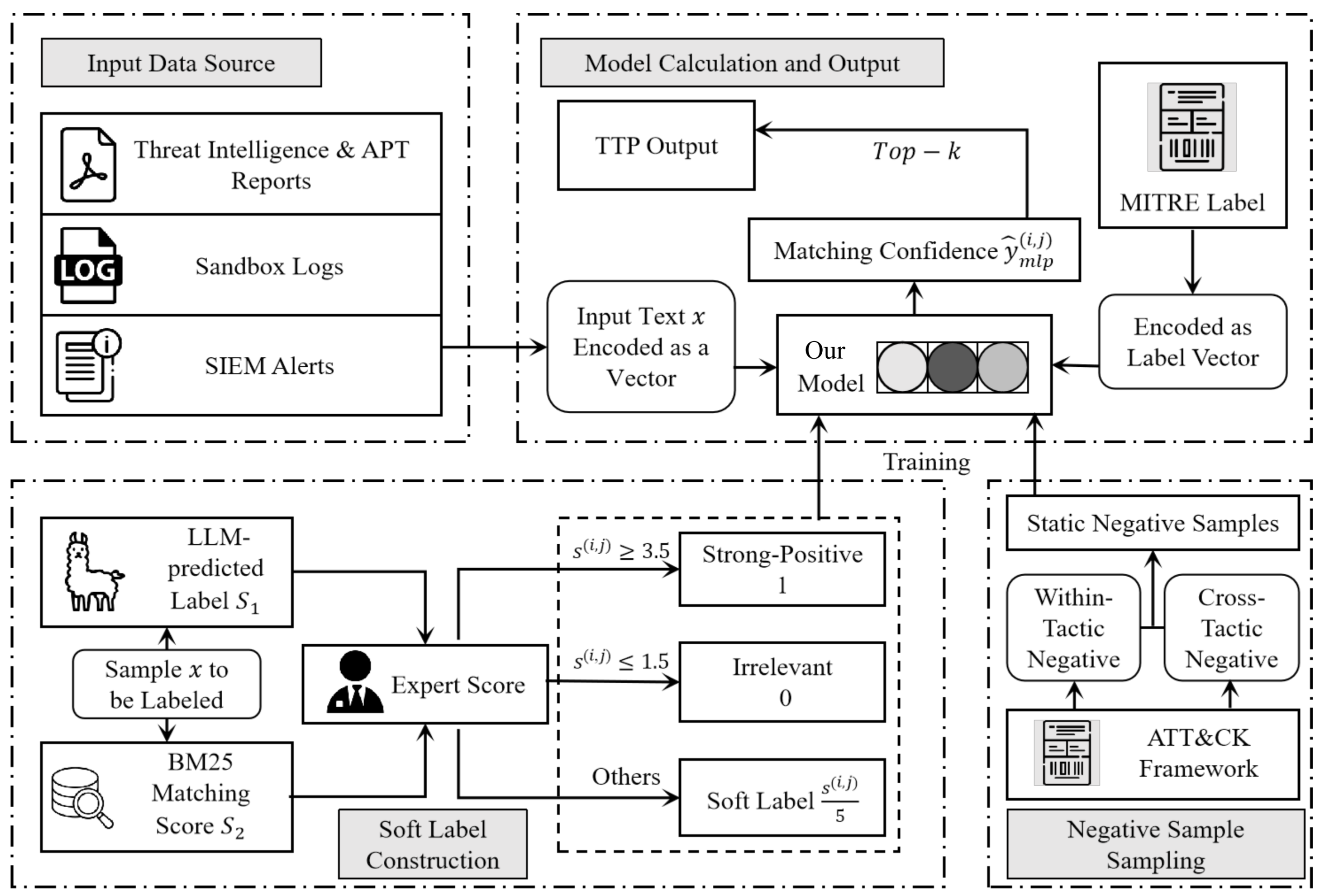 In cybersecurity, TTP identification aims to extract standardized MITRE ATT&CK labels from unstructured descriptions of attack behaviors. These labels support alert correlation, attack-chain reconstruction, and automated response by providing a unified semantic representation of adversarial actions. Input sources typically include threat intelligence reports, APT analyses, sandbox logs, SIEM alerts, and other heterogeneous textual data with diverse linguistic styles.