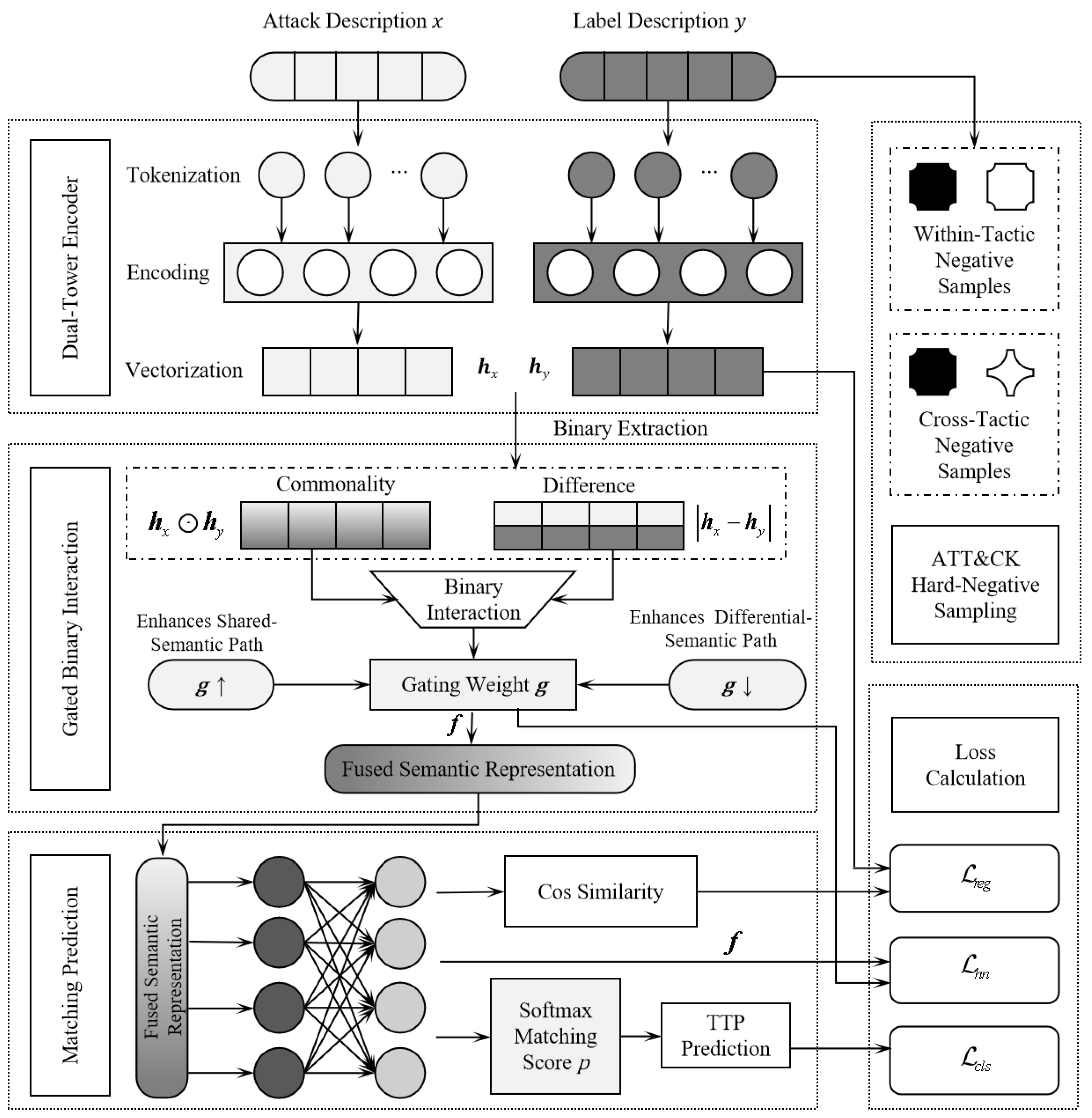 To address these issues, this work proposes a lightweight gated binary interaction model for semantic matching, termed DTGBI-TM. The model integrates soft–hard collaborative supervision, hierarchical hard-negative sampling, and dual-tower gated interaction modeling to enhance semantic representation and improve the adaptability of TTP identification in open and heterogeneous label spaces. DTGBI-TM is designed to extract deep semantic correlations between attack descriptions and TTP labels while retaining sensitivity to nuanced and complex semantic differences.