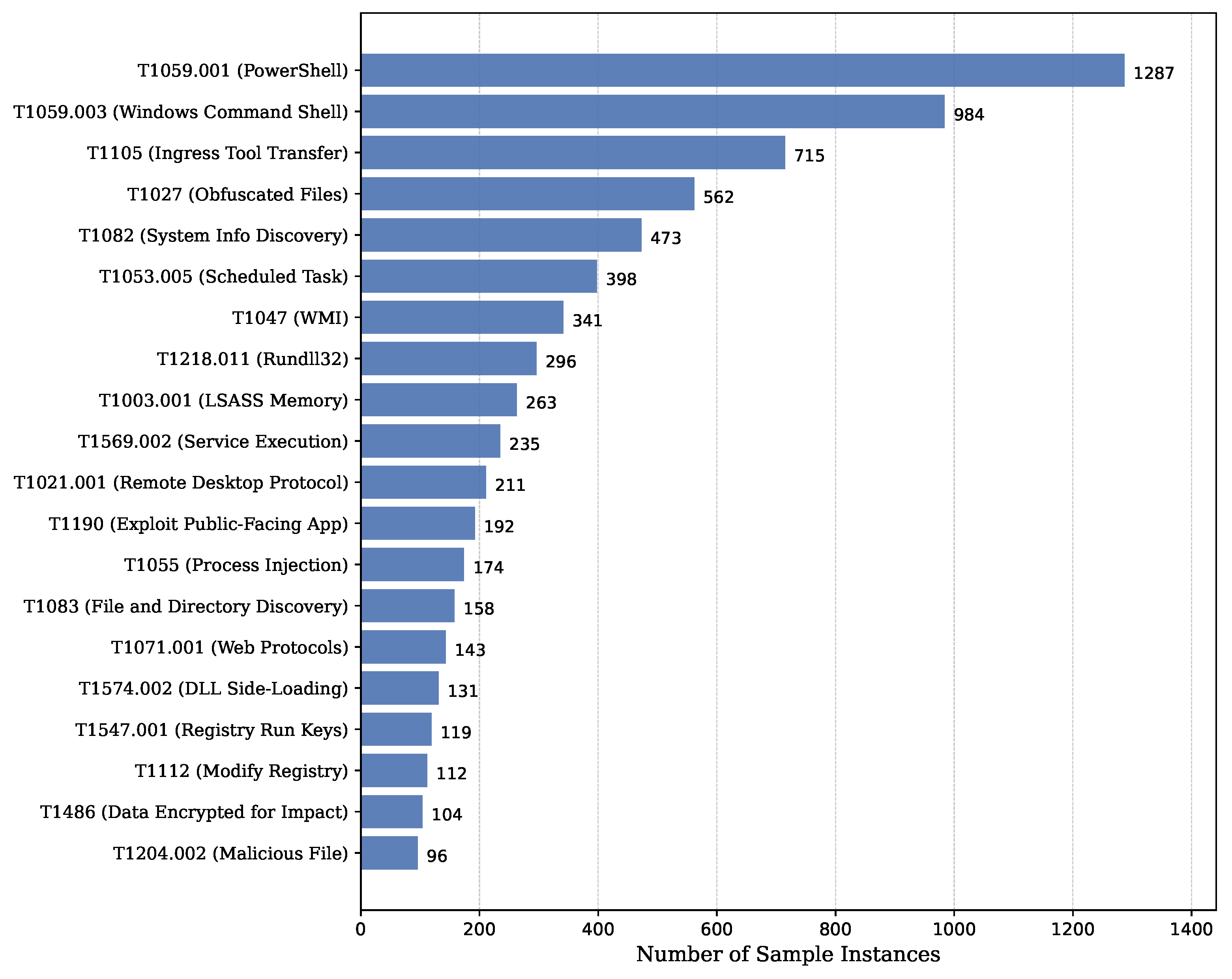 4]. Third, real-world TTP taxonomies are dynamic and open-ended, while annotated data typically exhibit long-tailed distributions, requiring models to generalize to unseen labels and remain robust under sparse samples [