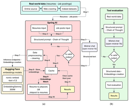 Our methodology for matching a resume to job posts and vice versa (job post to resumes) comprised several steps, as illustrated in Figure 1. The initial step involved collecting a diverse dataset of both unstructured and semi-structured resumes and job posts from https://www.indeed.com/. Depending on the match operation (resume to job posts OR job post to resumes), the dataset was fed to the Spring AI endpoints (Step 1). For each request, concerning a resume or a job post, a structured prompt was generated utilizing the CoT technique for text segmentation per topic of resume–job post, e.g., title, skills, education, etc., utilizing the NLP capabilities of the model (Step 2). The constructed request was fed as input to Mistral chat model (Step 3).