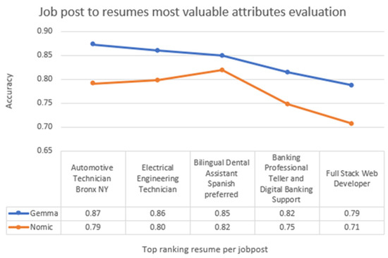 Across both use cases (Figure 5 and Figure 6), the accuracy of resume-to-job post matching ranged from 0.85 to 0.70 for Gemma and 0.73 to 0.60 for Nomic in the first case, and from 0.80 to 0.70 for Gemma and 0.73 to 0.61 for Nomic in the second. These results indicate robust performance across diverse occupation–resume pairs. As shown in Figure 5 and Figure 6, both embedding models exhibit consistent and stable behavior; however, Gemma demonstrates greater sensitivity and a finer capacity for capturing detailed semantic representations.