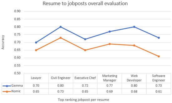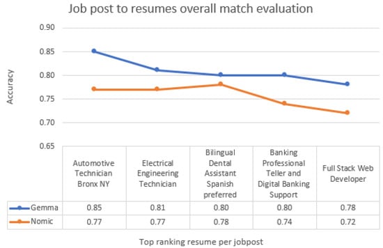 Following the generation of embeddings by Gemma and Nomic, each job post segment was systematically matched to the corresponding resume segment. Cosine similarity was employed to quantify the semantic proximity between segments, producing an individual similarity score for each pair. Once all resumes were processed, an aggregate matching score was computed for each job post–resume pair and ranked in descending order based on Gemma’s overall scores. The same procedure was applied inversely for resume-to-job posts matching. The results are illustrated in Figure 3.