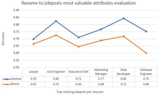 The same methodology was applied to resume-to-job post matching across different resume–occupation pairs, with each resume segment aligned to the corresponding job post segment. For the use case of most valuable attribute evaluation, the results are presented in Figure 5.