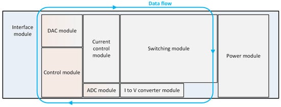 The second module in this group is the DAC module, built around the 16-channel DAC61416RHA converter from Texas Instruments Inc. (Dallas, TX, USA), which is configured via SPI by the digital control module. Of its nine utilized channels, six provide the primary voltage signals to the switching module. The remaining three channels are allocated for auxiliary functions: one sets the current limit in the current control module, one provides a bias voltage for the transimpedance amplifier, and one is reserved for testing.