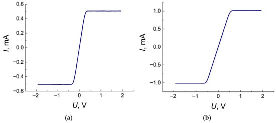 The voltage scan rate was 0.2 V/s. The resistive switching thresholds remained within a 2.5 V range, which is compatible with the 3.3 V operating voltage of 350 nm CMOS technology. As noted in Section 2, this compatibility is crucial for integration into transistor-accessed crossbar arrays, since the control methodology was designed to account for the voltage limitations of the access transistors. Detailed descriptions of the sample properties and switching mechanisms are provided in [34,35].