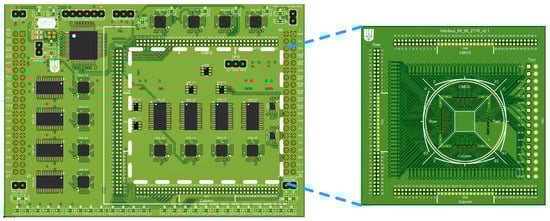 The module is controlled via a universal asynchronous receiver-transmitter (UART) interface or an FT232-based USB-UART bridge (FTDI, Glasgow, UK), through which data packets are transmitted to configure the multiplexers and activate the control circuits. Its central section features three connectors, for a custom board housing the memristor crossbar array’s bare die—a solution that proved faster and more practical than sourcing specialized integrated circuit (IC) packages incompatible with our specific die geometry. A distinctive feature of this device, representing the third core architectural principle, is the use of only six DAC channels to manage the memristor array—two per every control circuit—for conductance increase, decrease, and matrix transistor control (see Figure 2). With this configuration, the memristor crossbar array size (16 × 16, 64 × 64, etc.) is arbitrary and limited only by the number of multiplexers in the control circuits and their placement constraints on the compact PCB. We expect that this approach will represent a step toward minimizing area utilization in future integrated versions of the core.