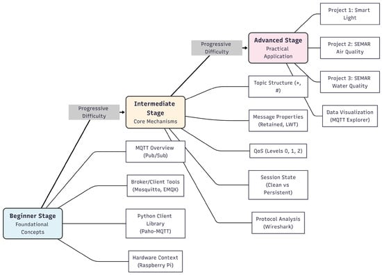 To address these challenges, our platform implements a progressive, three-stage educational framework. This framework is designed to smooth the learning curve by systematically scaffolding knowledge and integrating theory with hands-on practice. We divide the MQTT learning process into three stages, with each stage further broken down into multiple topics, as detailed below.