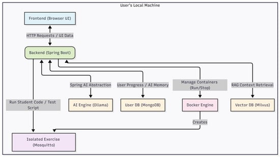 We selected Spring Boot [31] as it provides a stable foundation for the local application. Its primary role is to manage the interactions between the user interface and the backend services, including the AI engine and the Docker container lifecycle. We utilized the Spring AI [32] framework because it offers a clear abstraction layer for AI operations. This design simplifies development by decoupling the main application logic from the specific AI tools. This approach also supports future extensibility, allowing the AI engine or the vector store to be updated or replaced with minimal changes to the core code.