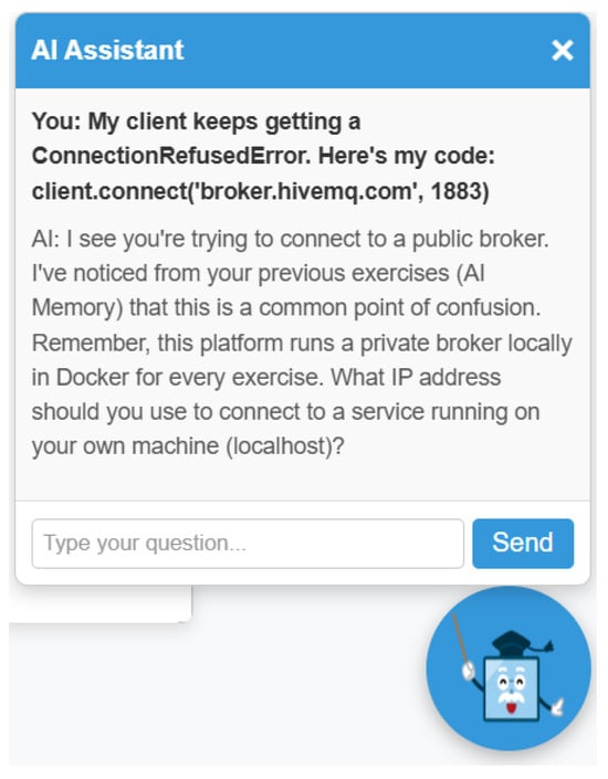 These configuration errors often cause MQTT programs to fail silently. This is exactly where our AI tutor adds value. The AI assistant can inspect a student’s configuration and code, detect these issues, and provide precise, context-aware hints that traditional materials cannot.
