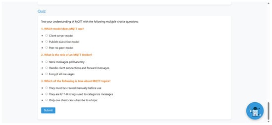 First, the educational content (Section 4.1) can be expanded. The current platform focuses on core MQTT concepts, such as the publish–subscribe model, topic hierarchies, QoS levels, retained messages, and basic session behavior, while deliberately abstracting away broker-level configurations and advanced protocol concerns. These include scalability, high-concurrency deployment, and production-level security mechanisms, which are beyond the scope of the present educational system. In future work, we plan to add more learning modules to cover a wider range of IoT protocols, such as CoAP [40] or AMQP [41], providing a broader IoT communication curriculum. We also plan to introduce advanced modules covering MQTT 5.0 features and secure communication practices.