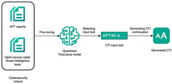 To generate high-quality cyber threat intelligence samples, a generative model was developed. As the primary purpose was to create realistic text with numerous technical details in the cybersecurity domain, a small open-source language model was utilized. The selected model, called unsloth/tinyllama-bnb-4bit, is a 4-bit quantized TinyLlama model, developed by the Unsloth team, with 631 million parameters [26]. The decision was made to use a pre-trained model, which was subsequently fine-tuned for the cybersecurity domain. This approach was driven by the fact that developing a high-performing language model from scratch is a resource-intensive and expensive process, particularly on a computer with a single GPU. This specific model was selected for several key reasons. Firstly, it was employed in the study to assess the small model’s generation capabilities and ease of adjusting to a new domain. Secondly, this choice enables a comparison of its performance with models used in other research, especially those utilizing GPT models [4,5]. Finally, by implementing the model’s quantization and utilizing the Unsloth framework for fine-tuning large language models [27], a significant reduction in memory usage and acceleration of calculations can be achieved.