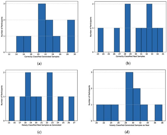 The results of human-based assessment will begin with the distributions of achieved accuracies, followed by the respective counts of true positives, true negatives, false positives, and false negatives. The results were astonishing, showing that even experienced analysts struggled to identify artificially generated CTIs. Figure 4a,b present the accuracy distributions (i.e., all correctly identified samples) among students and analysts. Among all participants, most of the scores are centered around 50%, indicating random choices. Eight scores fall in the range from 45% to 50%, and nine fall in the range from 52% to 57%. Three scores were below 45%, and only one participant achieved a score above 60%. Most results range between 47% and 55%, which constitutes 66.67% of all responses. None of the respondents exceeded 65%, which highlights the difficulties in identifying the generated texts. Particularly interesting are the scores below 45%, which are even worse than random guessing. The average score is 49.95%, with a standard deviation of 5.08 and a median of 49%. When analyzing student responses, the results vary, with a lack of clear patterns, ranging from 40% to 56%, with one score of 61% being the highest. Regarding analysts, their scores are divided into two groups: one ranging from 47% to 50%, and the second from 52% to 57%. Although their responses are generally better, with most scores above 50%, it still shows that even experienced cybersecurity analysts and threat hunters cannot distinguish between human-written and AI-generated CTI descriptions. The higher diversity among cybersecurity students may be due to limited experience.