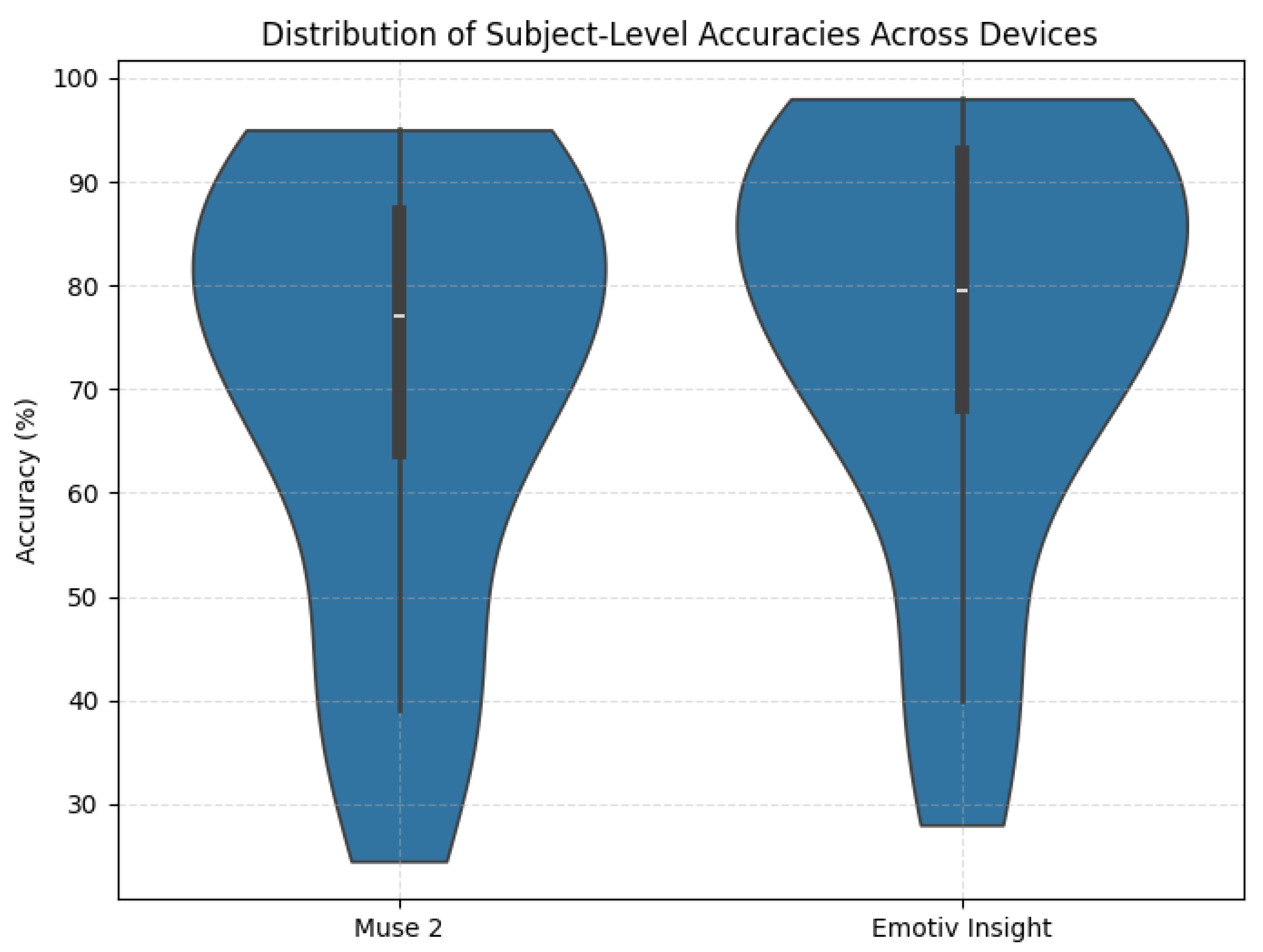 Figure 12 presents a violin plot illustrating the distribution of continuous per-subject accuracies for each device. Despite substantial differences in electrode placement, sampling rate, and signal characteristics, both datasets exhibit consistently high accuracies, indicating that the spectrogram-based CNN remains reliably effective across distinct commercial EEG systems.