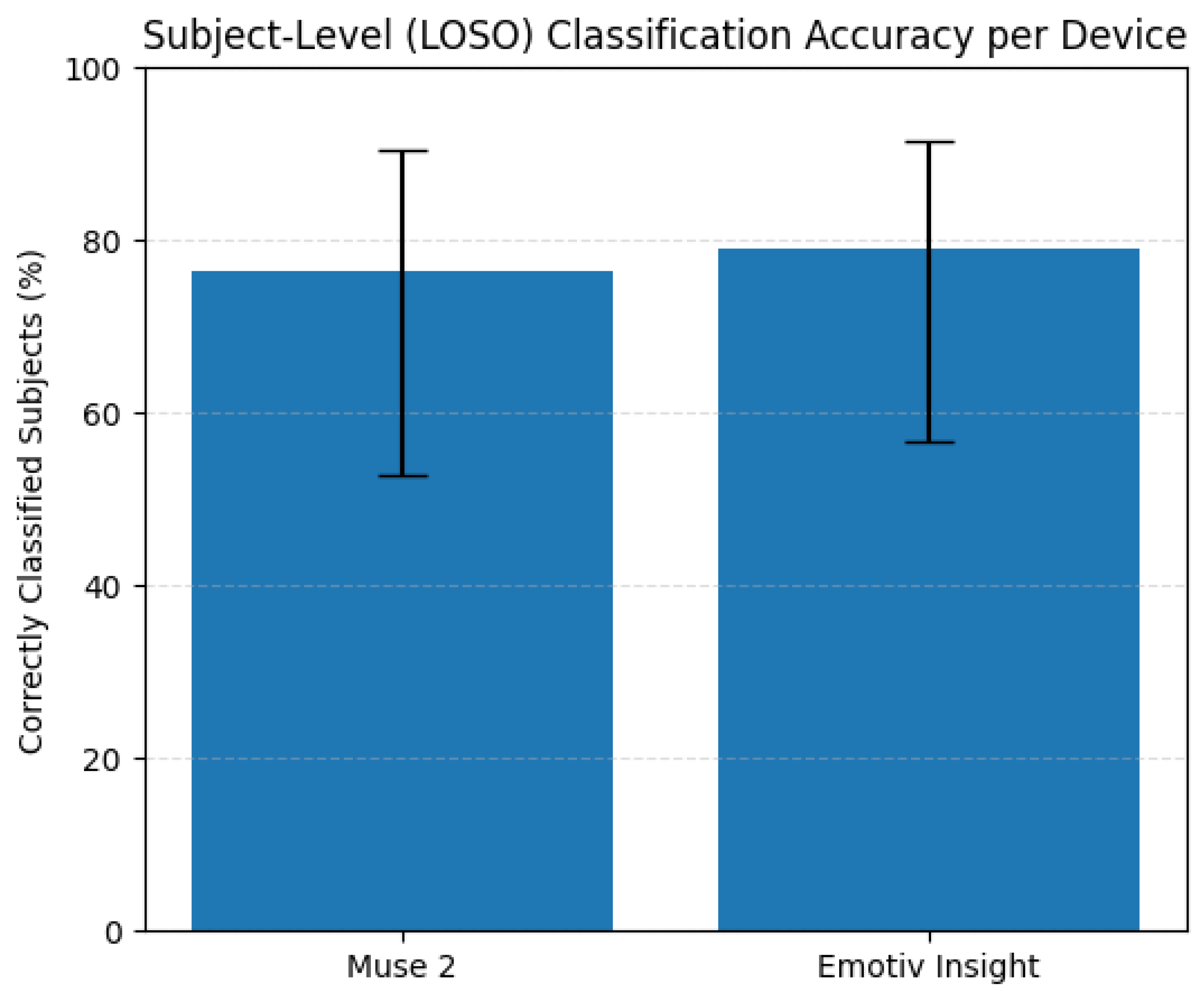 Regarding real-world applicability, the LOSO-CV technique approximates real-time performance evaluation. The results, although slightly lower than those obtained from the standard train–test split, remain promising. The Emotiv Insight dataset achieved 84% subject-level accuracy, with only 3 out of 19 subjects misclassified. Similarly, the Muse 2 dataset achieved 75% subject-level accuracy, misclassifying only 4 users. This reduction in performance compared to the epoch-level results (as shown in