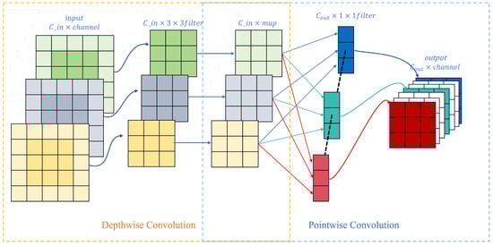 To address the computational and storage demands of modern CNNs, researchers have explored various strategies to balance efficiency and accuracy [7,8,9,10]. Representative examples include the MobileNet series [7,11,12] and the ShuffleNet series [8,13], both designed for mobile and embedded deployment. MobileNet introduced depthwise separable convolution (DSC), which decomposes standard convolution into a depthwise and a pointwise operation, greatly reducing parameters and FLOPs while preserving accuracy. ShuffleNet employed group convolution and channel shuffle to maintain information flow with minimal overhead. These designs demonstrate that lightweight networks can be achieved not only through reducing model size, but also by fundamentally improving convolutional efficiency. More recent architectures such as GhostNet [9] and EfficientNet [10] further refine this accuracy–efficiency balance through optimized module design and compound scaling.