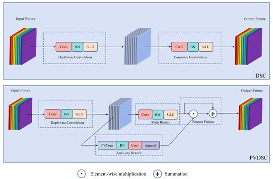 The proposed Preference-Value Depthwise Separable Convolution (PVDSC) introduces an auxiliary branch to enhance feature representation in the DSC framework. The main branch performs standard 1 × 1 pointwise convolution (PWConv) to aggregate channel information, while the auxiliary branch employs PVConv to extract preference-based responses. These responses form a preference tensor that adaptively modulates the main branch output via a residual gating mechanism, emphasizing salient features while keeping computational cost low. Figure 5 compares DSC and PVDSC structures.