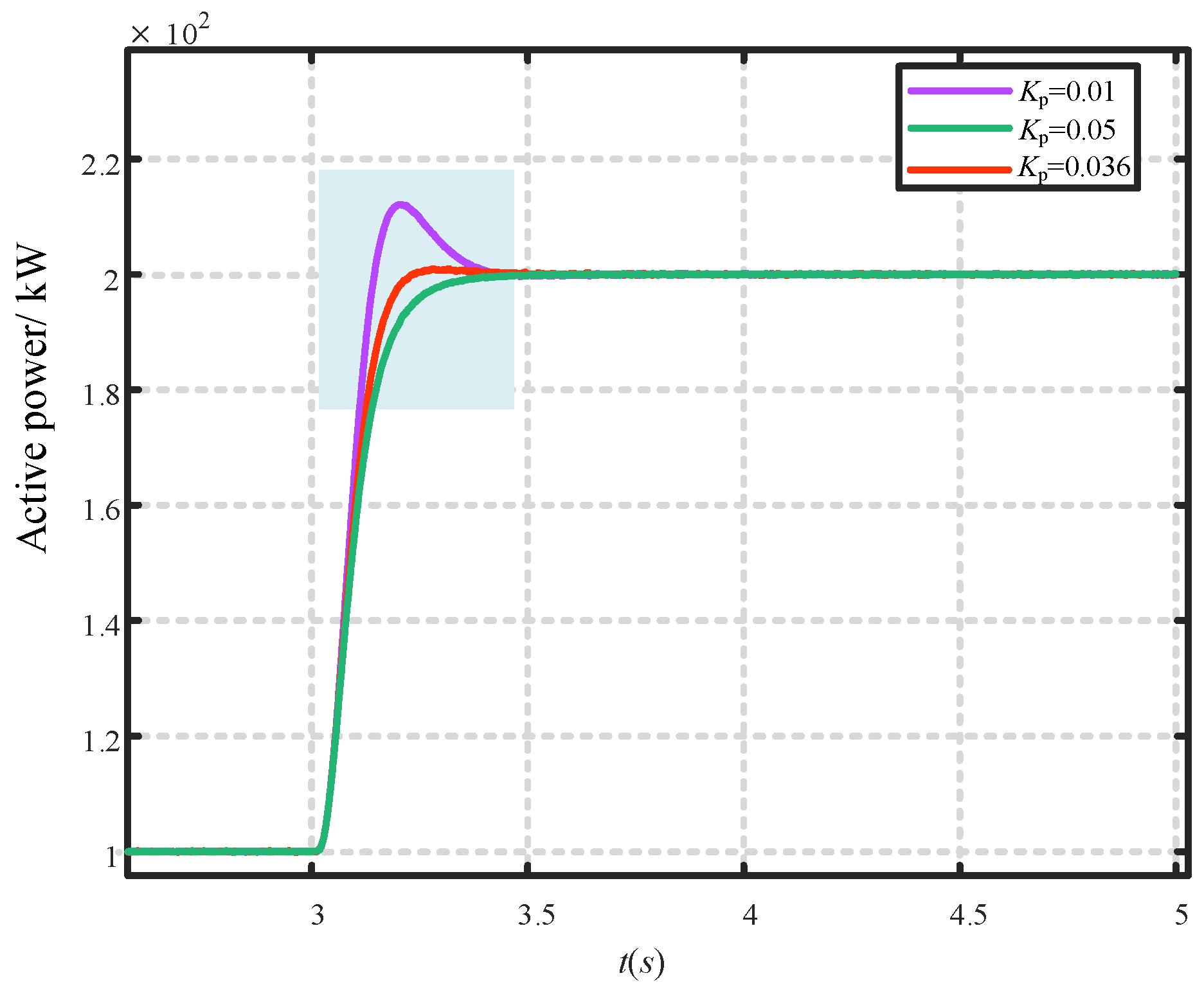 - In the active power-frequency control loop, a derivative and first-order inertial element is introduced, and the APDC algorithm is applied to reconstruct the system transfer function. Additionally, a particle swarm optimization algorithm is employed to determine the optimal derivative coefficient Kp, and following a grid active-power change, the VSG active-power output reaches the commanded steady-state value within 0.4 s, exhibiting neither overshoot nor oscillation.