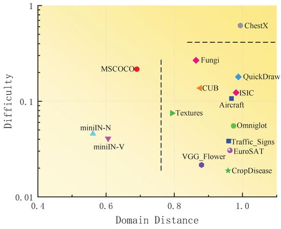 Distribution of domain distance and difficulty for 15 target datasets. The horizontal axis represents domain distance, determined by the distribution difference between the target dataset and the source dataset. The vertical axis represents the task difficulty, determined by the degree of linear separability of the target data. MiniIN-B was used as the source dataset, and RFS with ResNet-12 was used as the feature extractor. Based on the metric results, the target dataset can be categorized into three types: near-domain, far-domain low-difficulty, and far-domain high-difficulty.