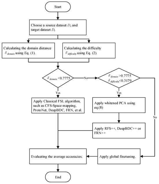 The remainder of this paper is organized as follows. Section 2 briefly reviews the related works on CD-FSL, feature post-processing, and domain metrics, highlighting our innovations and contributions. Section 3 presents the problem definition and introduces methods for measuring domain distance and difficulty; it also delineates detailed learning strategies tailored for near-domain, far-domain low-difficulty, and far-domain high-difficulty tasks based on these metrics. Section 4 conducts measurements of domain distance and difficulty across 15 target datasets, comprehensively evaluates the effectiveness of the DCS through experiments, and provides an analysis and discussion of the experimental results. Finally, Section 5 draws the main conclusions.