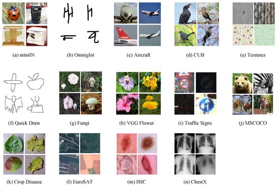 - Triantafillou, E.; Zhu, T.; Dumoulin, V.; Lamblin, P.; Evci, U.; Xu, K.; Goroshin, R.; Gelada, C.; Swersky, K.; Manzagol, P.A.; et al. Meta-Dataset: A Dataset of Datasets for Learning to Learn from Few Examples. In Proceedings of the International Conference on Learning Representations, New Orleans, LA, USA, 6–9 May 2019. [Google Scholar]