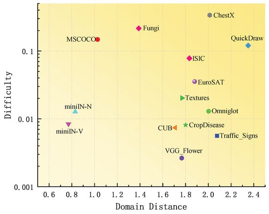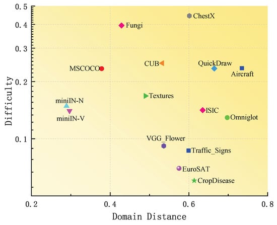Using the domain distance and difficulty formula provided in Section 3.2, we extracted features for the source dataset and the 15 target datasets using the RFS model. Table 1 shows the statistical results of the domain distance and difficulty. As expected, miniIN-B has a domain distance of zero from itself and exhibits the lowest difficulty level. Both miniIN-V and miniIN-N, which are derived from the same dataset, have relatively small domain distances from . The domain distances for the other datasets gradually increase as the discrepancy in data distribution widens.