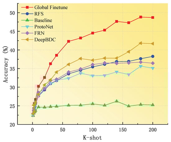 For 5-way K-shot tasks on ChestX, we experimentally conducted research on global finetuning to enhance the model’s representation capabilities. K was set from 1 to 200 to validate the trend of our method as K changes. For comparison, with the parameters of the backbone frozen, we evaluated the few-shot classification accuracy of RFS [28], Baseline [11], ProtoNet [8], FRN [10], and DeepBDC [9] in the same way. The experimental results are shown in Figure 8. It can be seen that global finetuning can significantly improve the model’s ability to adapt to difficult tasks, making its accuracies on ChestX surpass the second-best model (DeepBDC) by more than 40%. Furthermore, as K increases, the advantages of global finetuning become significant. However, other models show obvious performance saturation as K increases. Evidently, for far-domain high-difficulty FSL tasks, global finetuning consistently leads to improved performance without concerns of overfitting due to the model’s inadequate nonlinear representation.
