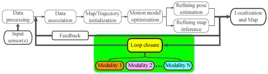 Improving loop closure is crucial for building accurate and consistent maps in SLAM. One effective approach is to use multiple sources of information and multimodal data. For instance, combining data from a camera and LiDAR enhances the system’s ability to detect loop closures, as each sensor provides different types of information. This multimodal approach not only leverages the complementary strengths of each sensor but also reduces the impact of errors from individual sensors, thereby increasing the overall robustness of the system []. Additionally, integrating different methods of data representation (multiple modalities) from the same information source enriches the representation space and makes the system less vulnerable to missing crucial information.