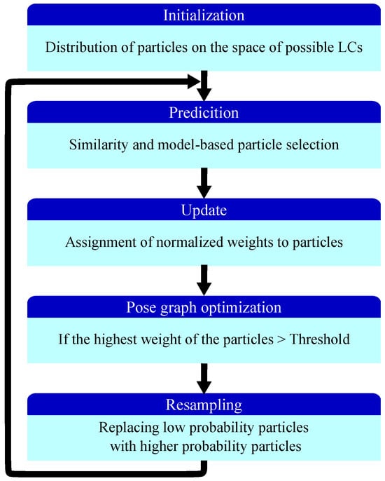 To clarify the methodology, Figure 2 provides a step-by-step illustration of the particle filtering process employed in the SGPF approach. The figure outlines the key stages of the process, starting from candidate generation, followed by similarity computation and particle propagation, to the final validation of LCD and the resampling step.